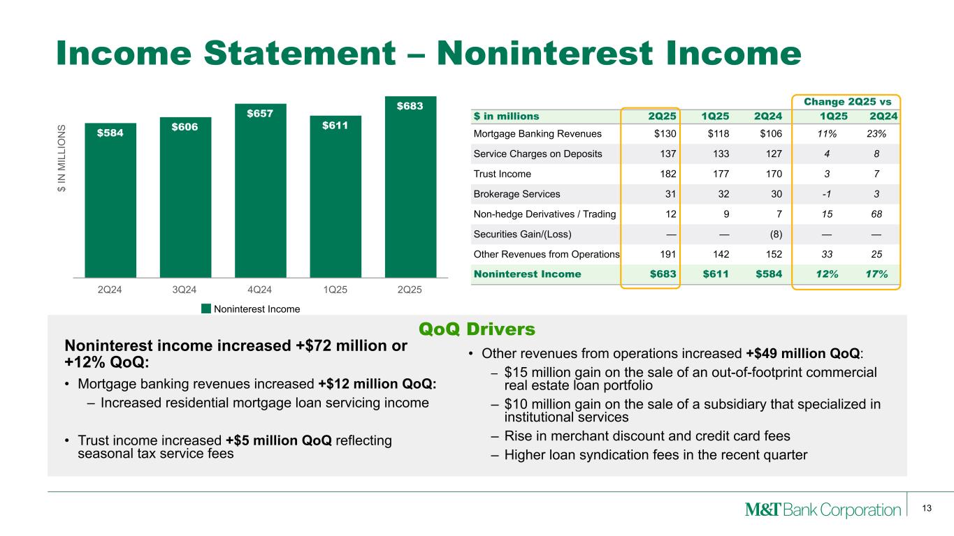 12 Balance Sheet – Average Deposits QoQ Drivers Average deposits increased +$2.2 billion or +1% QoQ: • Interest-bearing deposit cost increased +1 bp – Non-brokered interest-bearing deposit cost increased +3 bps – Brokered deposit cost decreased -6 bps • Average interest-bearing deposits rose +$2.5 billion or +2% • Average brokered deposits declined -$279 million or -3% $ IN B IL LI O N S $47.7 $46.2 $46.5 $45.4 $45.1 $96.0 $98.3 $102.1 $101.6 $104.0 $19.8 $17.0 $16.0 $14.2 $14.3 $163.5 $161.5 $164.6 $161.2 $163.4 Noninterest-bearing Deposits Savings and Interest-checking Deposits Time Deposits Total Deposits 2Q24 3Q24 4Q24 1Q25 2Q25 2Q24 3Q24 4Q24 1Q25 2Q25 Total deposit cost 2.06% 2.06% 1.90% 1.70% 1.72% Interest-bearing deposit cost 2.90% 2.88% 2.64% 2.37% 2.38%