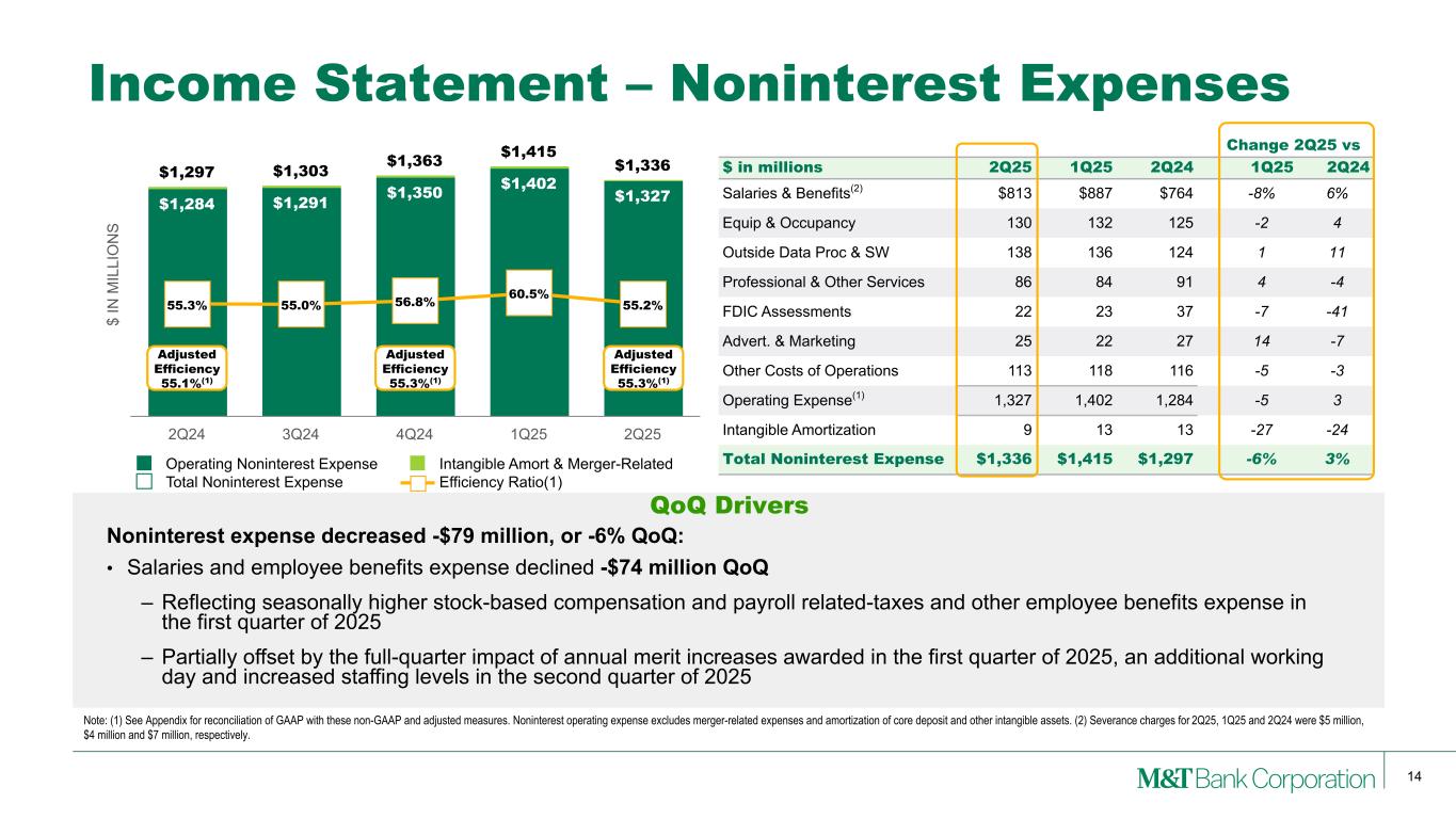 13 $ IN M IL LI O N S $584 $606 $657 $611 $683 Noninterest Income 2Q24 3Q24 4Q24 1Q25 2Q25 Change 2Q25 vs $ in millions 2Q25 1Q25 2Q24   1Q25 2Q24 Mortgage Banking Revenues $130 $118 $106 11% 23% Service Charges on Deposits 137 133 127 4 8 Trust Income 182 177 170 3 7 Brokerage Services 31 32 30 -1 3 Non-hedge Derivatives / Trading 12 9 7 15 68 Securities Gain/(Loss) — — (8) — — Other Revenues from Operations 191 142 152 33 25 Noninterest Income $683 $611 $584   12% 17% Income Statement – Noninterest Income Noninterest income increased +$72 million or +12% QoQ: • Mortgage banking revenues increased +$12 million QoQ: – Increased residential mortgage loan servicing income • Trust income increased +$5 million QoQ reflecting seasonal tax service fees • Other revenues from operations increased +$49 million QoQ: – $15 million gain on the sale of an out-of-footprint commercial real estate loan portfolio – $10 million gain on the sale of a subsidiary that specialized in institutional services – Rise in merchant discount and credit card fees – Higher loan syndication fees in the recent quarter QoQ Drivers