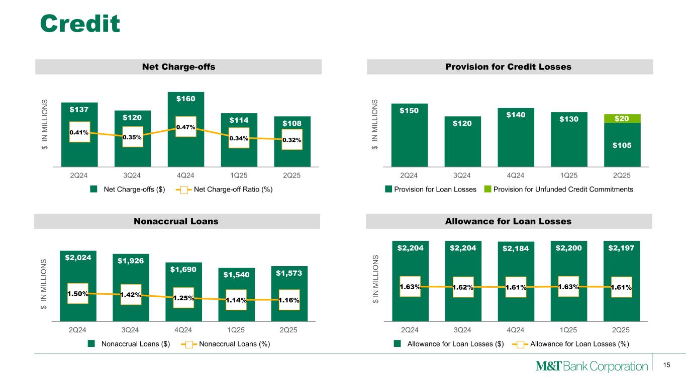14 $ IN M IL LI O N S $1,284 $1,291 $1,350 $1,402 $1,327 $1,297 $1,303 $1,363 $1,415 $1,336 55.3% 55.0% 56.8% 60.5% 55.2% Operating Noninterest Expense Intangible Amort & Merger-Related Total Noninterest Expense Efficiency Ratio(1) 2Q24 3Q24 4Q24 1Q25 2Q25 Change 2Q25 vs $ in millions 2Q25 1Q25 2Q24 1Q25 2Q24 Salaries & Benefits(2) $813 $887 $764 -8% 6% Equip & Occupancy 130 132 125 -2 4 Outside Data Proc & SW 138 136 124 1 11 Professional & Other Services 86 84 91 4 -4 FDIC Assessments 22 23 37 -7 -41 Advert. & Marketing 25 22 27 14 -7 Other Costs of Operations 113 118 116 -5 -3 Operating Expense(1) 1,327 1,402 1,284 -5 3 Intangible Amortization 9 13 13 -27 -24 Total Noninterest Expense $1,336 $1,415 $1,297   -6% 3% Income Statement – Noninterest Expenses Noninterest expense decreased -$79 million, or -6% QoQ: • Salaries and employee benefits expense declined -$74 million QoQ – Reflecting seasonally higher stock-based compensation and payroll related-taxes and other employee benefits expense in the first quarter of 2025 – Partially offset by the full-quarter impact of annual merit increases awarded in the first quarter of 2025, an additional working day and increased staffing levels in the second quarter of 2025 Note: (1) See Appendix for reconciliation of GAAP with these non-GAAP and adjusted measures. Noninterest operating expense excludes merger-related expenses and amortization of core deposit and other intangible assets. (2) Severance charges for 2Q25, 1Q25 and 2Q24 were $5 million, $4 million and $7 million, respectively. QoQ Drivers Adjusted Efficiency 55.1%(1) Adjusted Efficiency 55.3%(1) Adjusted Efficiency 55.3%(1)