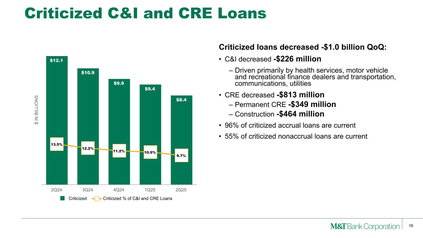 15 $ IN M IL LI O N S Nonaccrual Loans $2,024 $1,926 $1,690 $1,540 $1,573 1.50% 1.42% 1.25% 1.14% 1.16% Nonaccrual Loans ($) Nonaccrual Loans (%) 2Q24 3Q24 4Q24 1Q25 2Q25 $ IN M IL LI O N S Net Charge-offs $137 $120 $160 $114 $108 0.41% 0.35% 0.47% 0.34% 0.32% Net Charge-offs ($) Net Charge-off Ratio (%) 2Q24 3Q24 4Q24 1Q25 2Q25 Credit $ IN M IL LI O N S Allowance for Loan Losses $2,204 $2,204 $2,184 $2,200 $2,197 1.63% 1.62% 1.61% 1.63% 1.61% Allowance for Loan Losses ($) Allowance for Loan Losses (%) 2Q24 3Q24 4Q24 1Q25 2Q25 $ IN M IL LI O N S Provision for Credit Losses $150 $120 $140 $130 $105 $20 Provision for Loan Losses Provision for Unfunded Credit Commitments 2Q24 3Q24 4Q24 1Q25 2Q25