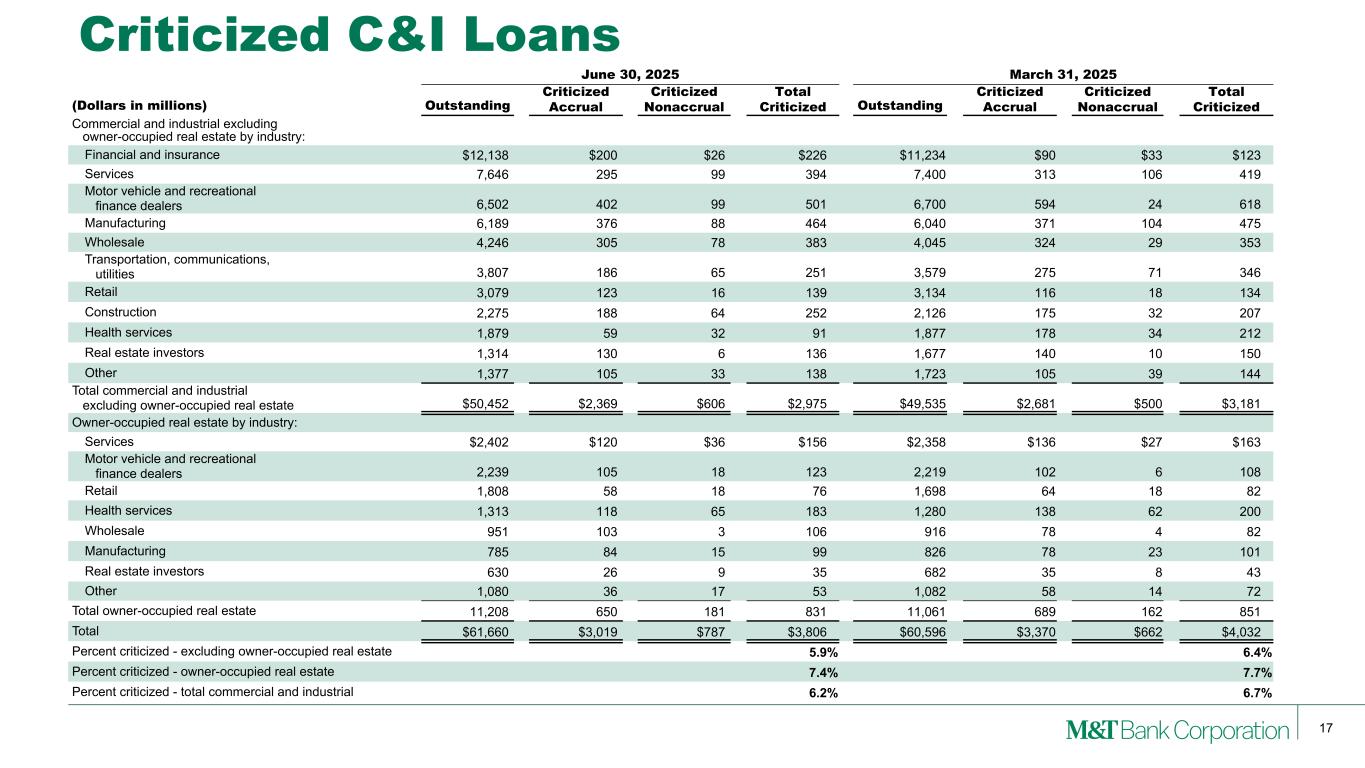 17 Criticized C&I Loans June 30, 2025 March 31, 2025 (Dollars in millions) Outstanding Criticized Accrual Criticized Nonaccrual Total Criticized Outstanding Criticized Accrual Criticized Nonaccrual Total Criticized Commercial and industrial excluding owner-occupied real estate by industry: Financial and insurance $12,138 $200 $26 $226 $11,234 $90 $33 $123 Services 7,646 295 99 394 7,400 313 106 419 Motor vehicle and recreational finance dealers 6,502 402 99 501 6,700 594 24 618 Manufacturing 6,189 376 88 464 6,040 371 104 475 Wholesale 4,246 305 78 383 4,045 324 29 353 Transportation, communications, utilities 3,807 186 65 251 3,579 275 71 346 Retail 3,079 123 16 139 3,134 116 18 134 Construction 2,275 188 64 252 2,126 175 32 207 Health services 1,879 59 32 91 1,877 178 34 212 Real estate investors 1,314 130 6 136 1,677 140 10 150 Other 1,377 105 33 138 1,723 105 39 144 Total commercial and industrial excluding owner-occupied real estate $50,452 $2,369 $606 $2,975 $49,535 $2,681 $500 $3,181 Owner-occupied real estate by industry: Services $2,402 $120 $36 $156 $2,358 $136 $27 $163 Motor vehicle and recreational finance dealers 2,239 105 18 123 2,219 102 6 108 Retail 1,808 58 18 76 1,698 64 18 82 Health services 1,313 118 65 183 1,280 138 62 200 Wholesale 951 103 3 106 916 78 4 82 Manufacturing 785 84 15 99 826 78 23 101 Real estate investors 630 26 9 35 682 35 8 43 Other 1,080 36 17 53 1,082 58 14 72 Total owner-occupied real estate 11,208 650 181 831 11,061 689 162 851 Total $61,660 $3,019 $787 $3,806 $60,596 $3,370 $662 $4,032 Percent criticized - excluding owner-occupied real estate 5.9 % 6.4 % Percent criticized - owner-occupied real estate 7.4 % 7.7 % Percent criticized - total commercial and industrial 6.2 % 6.7 %