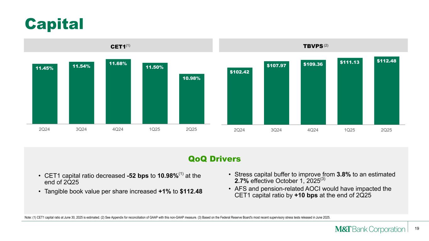 18 Criticized CRE Loans June 30, 2025 March 31, 2025 (Dollars in millions) Outstanding Criticized Accrual Criticized Nonaccrual Total Criticized Outstanding Criticized Accrual Criticized Nonaccrual Total Criticized Permanent finance by property type: Apartments/Multifamily $6,082 $600 $73 $673 $5,593 $713 $94 $807 Retail/Service 4,435 745 81 826 4,548 713 87 800 Office 3,720 807 102 909 3,997 965 68 1,033 Industrial/Warehouse 2,098 138 11 149 1,898 133 13 146 Hotel 1,889 313 87 400 1,887 249 110 359 Health services 1,669 302 21 323 1,883 463 21 484 Other 262 30 1 31 290 30 1 31 Total permanent 20,155 2,935 376 3,311 20,096 3,266 394 3,660 Construction/Development 4,412 1,219 24 1,243 5,771 1,678 29 1,707 Total $24,567 $4,154 $400 $4,554 $25,867 $4,944 $423 $5,367 Percent criticized - total commercial real estate 18.5 % 20.7 %