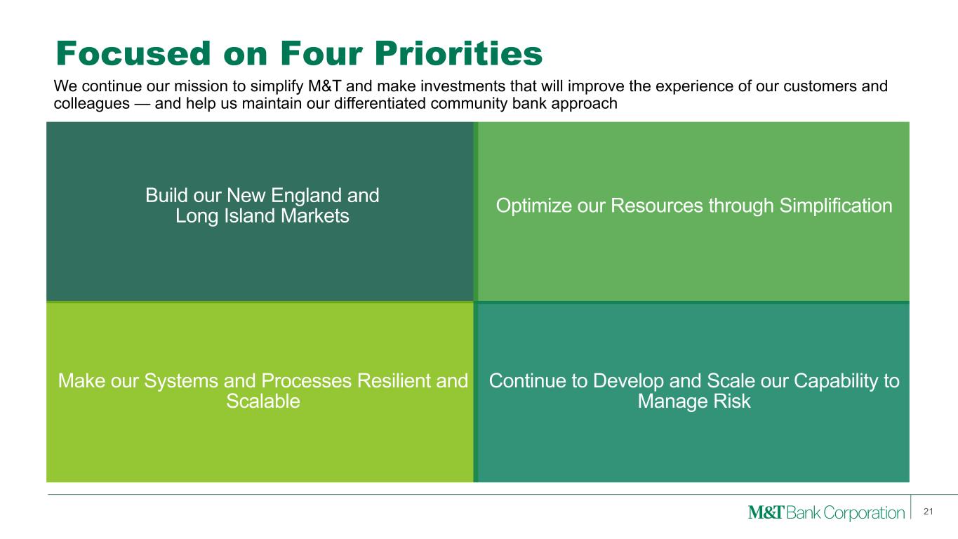 Focused on Four Priorities 21 Build our New England and Long Island Markets Optimize our Resources through Simplification Make our Systems and Processes Resilient and Scalable Continue to Develop and Scale our Capability to Manage Risk We continue our mission to simplify M&T and make investments that will improve the experience of our customers and colleagues — and help us maintain our differentiated community bank approach