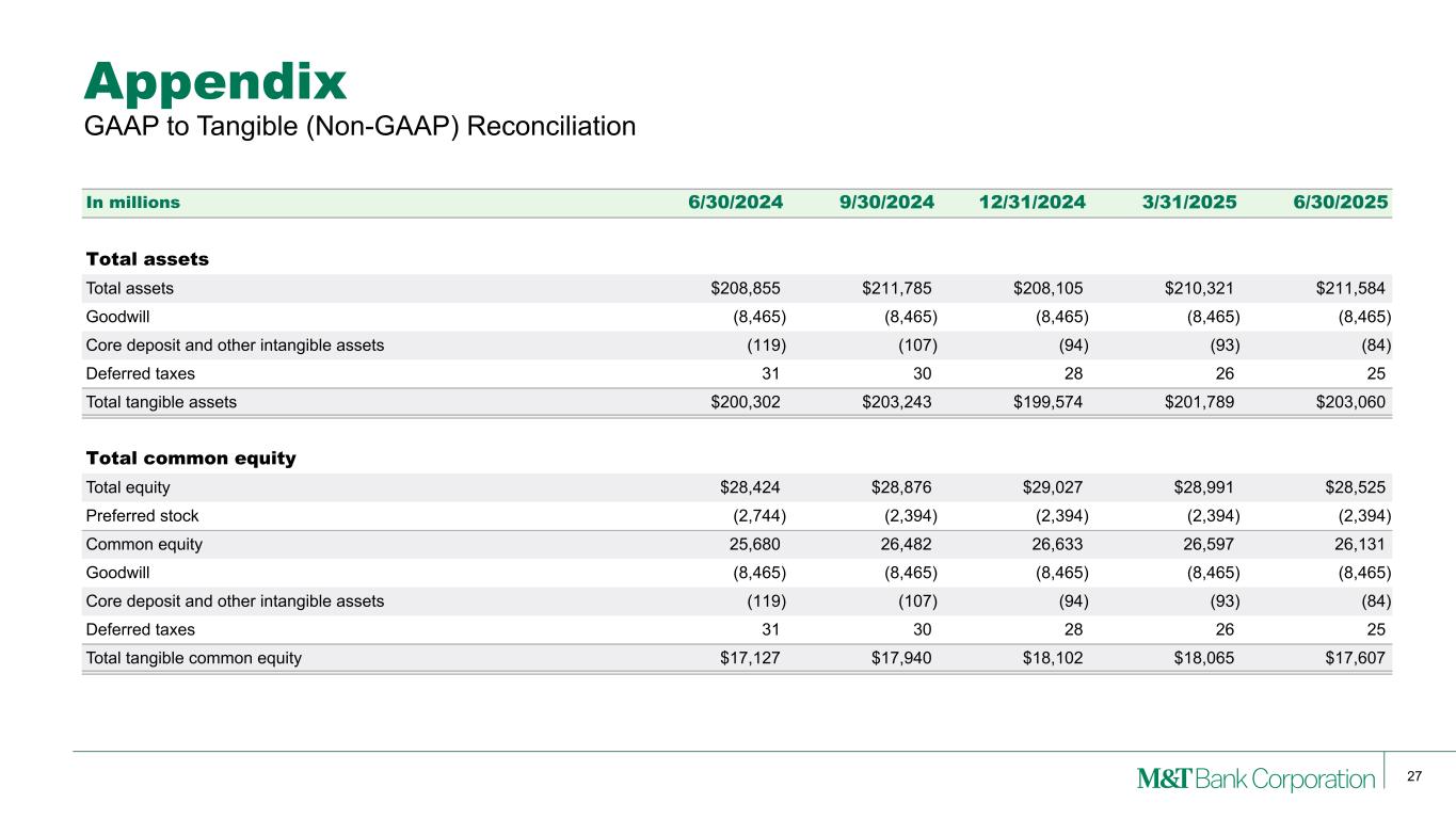26 Appendix In millions 2Q24 3Q24 4Q24 1Q25 2Q25 Average assets Average assets $211,981 $209,581 $211,853 $208,321 $210,261 Goodwill (8,465) (8,465) (8,465) (8,465) (8,465) Core deposit and other intangible assets (126) (113) (100) (92) (89) Deferred taxes 30 28 29 27 26 Average tangible assets $203,420 $201,031 $203,317 $199,791 $201,733 Average common equity Average total equity $27,745 $28,725 $28,707 $28,998 $28,666 Preferred stock (2,405) (2,565) (2,394) (2,394) (2,394) Average common equity 25,340 26,160 26,313 26,604 26,272 Goodwill (8,465) (8,465) (8,465) (8,465) (8,465) Core deposit and other intangible assets (126) (113) (100) (92) (89) Deferred taxes 30 28 29 27 26 Average tangible common equity $16,779 $17,610 $17,777 $18,074 $17,744 GAAP to Tangible (Non-GAAP) Reconciliation