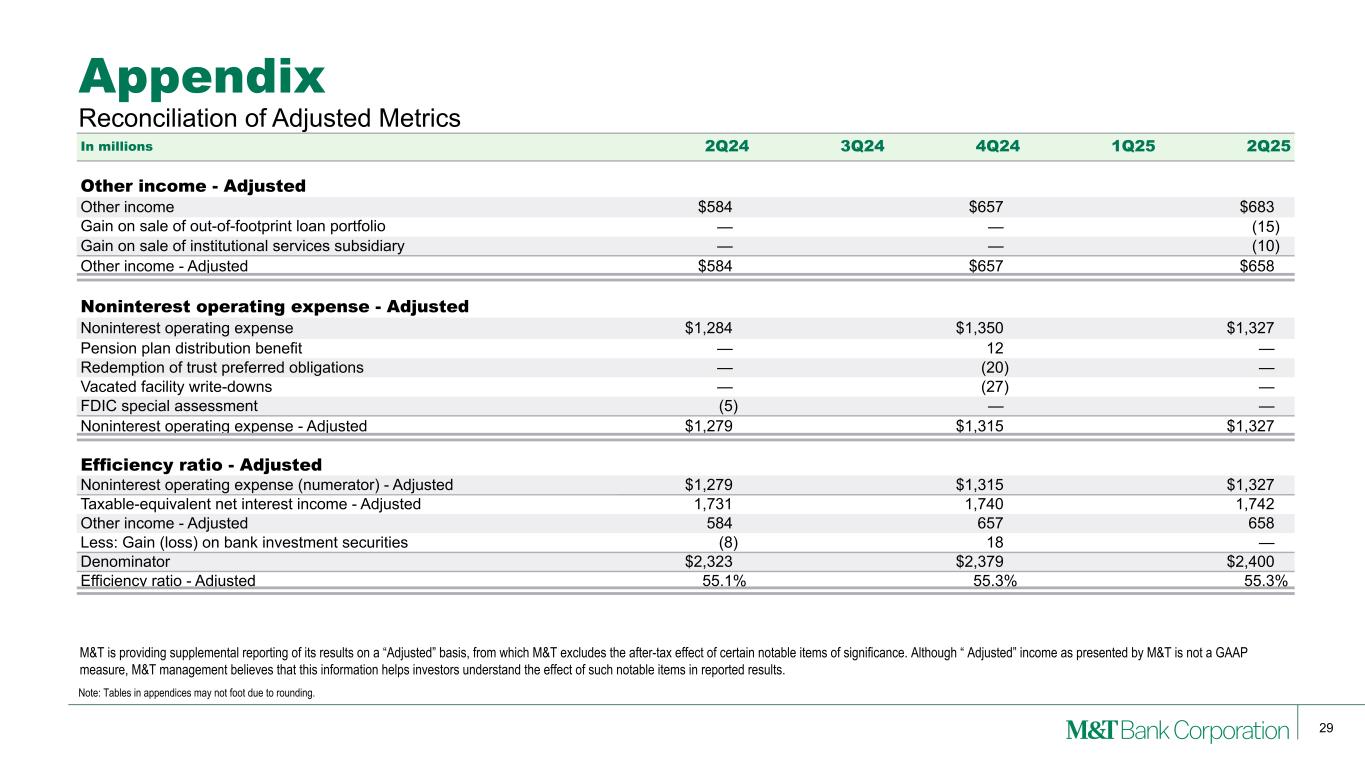 29 Appendix Note: Tables in appendices may not foot due to rounding. Reconciliation of Adjusted Metrics In millions 2Q24 3Q24 4Q24 1Q25 2Q25 Other income - Adjusted Other income $584 $657 $683 Gain on sale of out-of-footprint loan portfolio — — (15) Gain on sale of institutional services subsidiary — — (10) Other income - Adjusted $584 $657 $658 Noninterest operating expense - Adjusted Noninterest operating expense $1,284 $1,350 $1,327 Pension plan distribution benefit — 12 — Redemption of trust preferred obligations — (20) — Vacated facility write-downs — (27) — FDIC special assessment (5) — — Noninterest operating expense - Adjusted $1,279 $1,315 $1,327 Efficiency ratio - Adjusted Noninterest operating expense (numerator) - Adjusted $1,279 $1,315 $1,327 Taxable-equivalent net interest income - Adjusted 1,731 1,740 1,742 Other income - Adjusted 584 657 658 Less: Gain (loss) on bank investment securities (8) 18 — Denominator $2,323 $2,379 $2,400 Efficiency ratio - Adjusted 55.1% 55.3% 55.3% M&T is providing supplemental reporting of its results on a “Adjusted” basis, from which M&T excludes the after-tax effect of certain notable items of significance. Although “ Adjusted” income as presented by M&T is not a GAAP measure, M&T management believes that this information helps investors understand the effect of such notable items in reported results.
