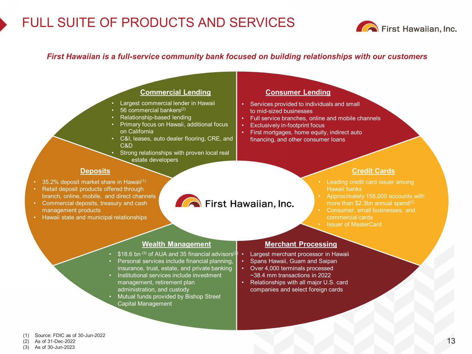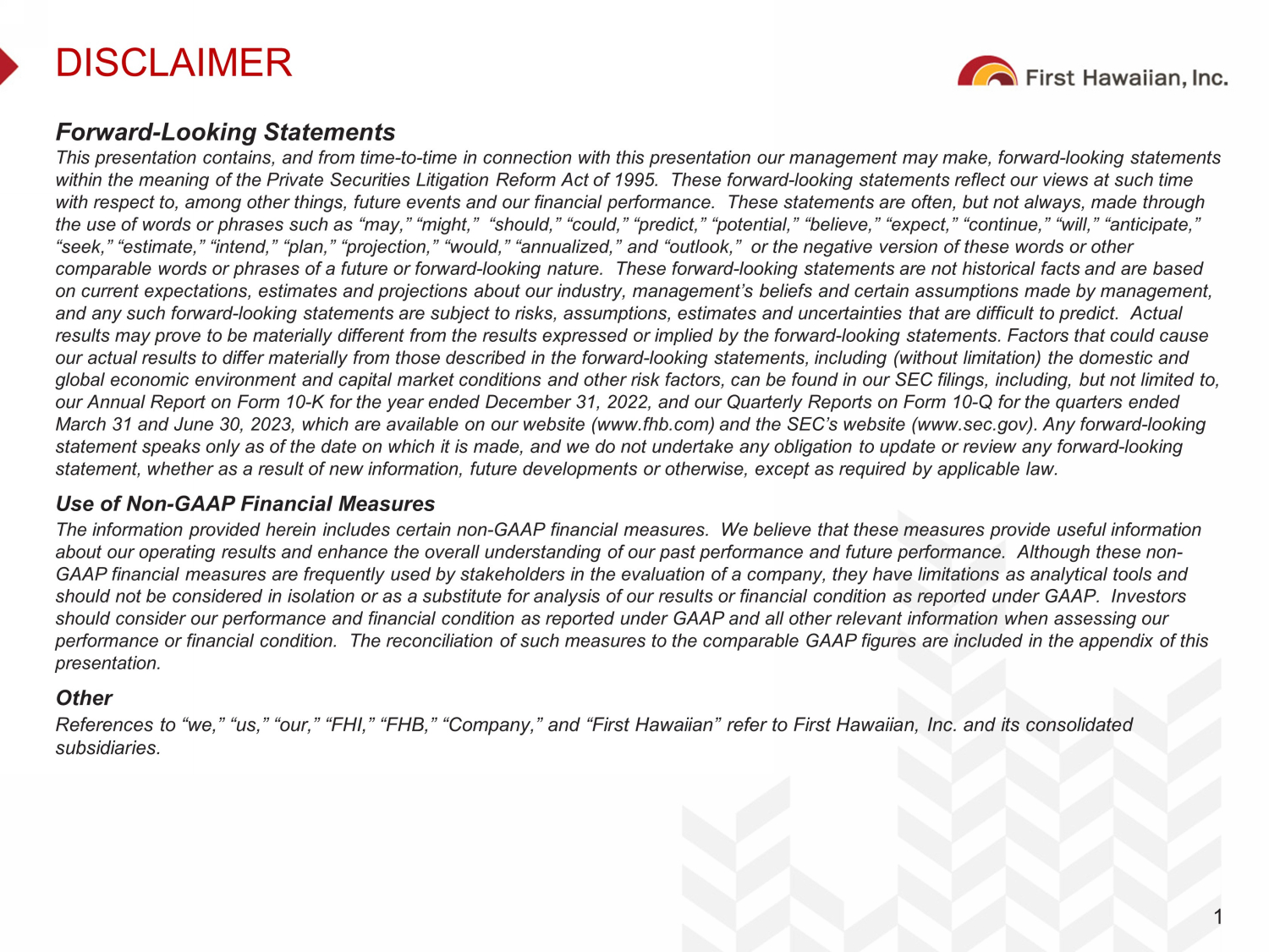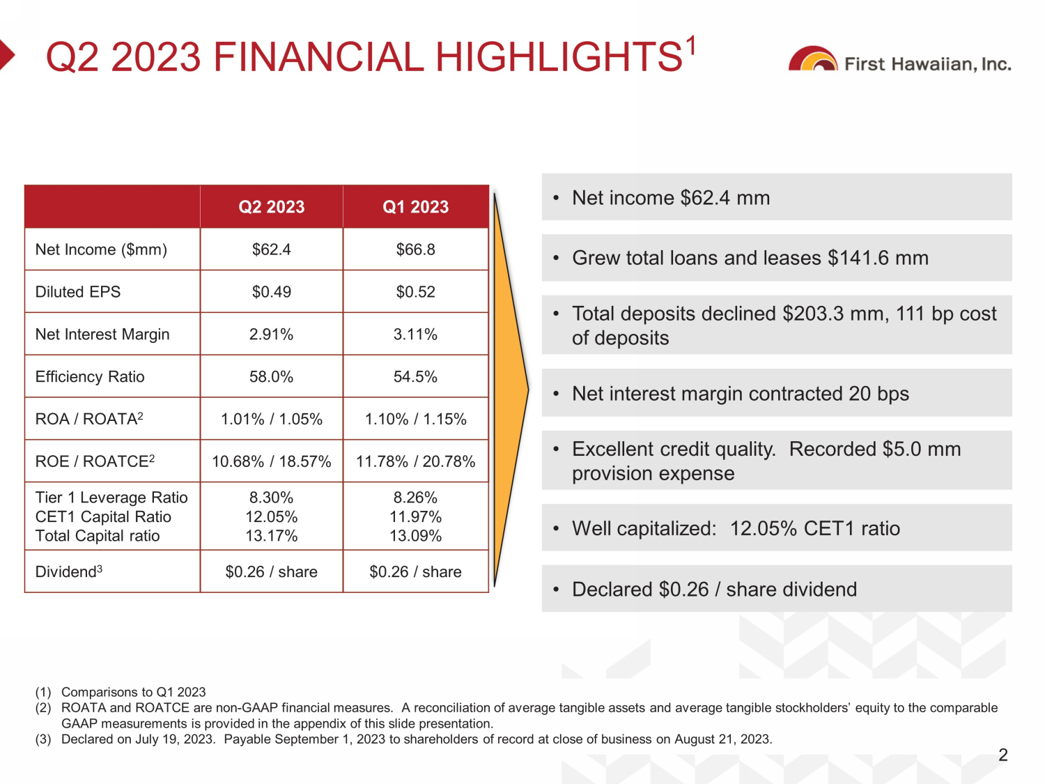 DISCLAIMER Forward - Looking Statements This presentation contains, and from time - to - time in connection with this presentation our management may make, forward - looking statements within the meaning of the Private Securities Litigation Reform Act of 1995. These forward - looking statements reflect our views at such time with respect to, among other things, future events and our financial performance. These statements are often, but not always , m ade through the use of words or phrases such as “may,” “might,” “should,” “could,” “predict,” “potential,” “believe,” “expect,” “continu e,” “will,” “anticipate,” “seek,” “estimate,” “intend,” “plan,” “projection,” “would,” “annualized,” and “outlook,” or the negative version of these w ord s or other comparable words or phrases of a future or forward - looking nature. These forward - looking statements are not historical facts an d are based on current expectations, estimates and projections about our industry, management’s beliefs and certain assumptions made by m ana gement, and any such forward - looking statements are subject to risks, assumptions, estimates and uncertainties that are difficult to pre dict. Actual results may prove to be materially different from the results expressed or implied by the forward - looking statements. Factors th at could cause our actual results to differ materially from those described in the forward - looking statements, including (without limitation) t he domestic and global economic environment and capital market conditions and other risk factors, can be found in our SEC filings, including, bu t not limited to, our Annual Report on Form 10 - K for the year ended December 31, 2022, and our Quarterly Reports on Form 10 - Q for the quarters end ed March 31 and June 30, 2023, which are available on our website (www.fhb.com) and the SEC’s website (www.sec.gov). Any forward - lo oking statement speaks only as of the date on which it is made, and we do not undertake any obligation to update or review any forw ard - looking statement, whether as a result of new information, future developments or otherwise, except as required by applicable law. Use of Non - GAAP Financial Measures The information provided herein includes certain non - GAAP financial measures. We believe that these measures provide useful inf ormation about our operating results and enhance the overall understanding of our past performance and future performance. Although t hes e non - GAAP financial measures are frequently used by stakeholders in the evaluation of a company, they have limitations as analytic al tools and should not be considered in isolation or as a substitute for analysis of our results or financial condition as reported under GA AP. Investors should consider our performance and financial condition as reported under GAAP and all other relevant information when assess ing our performance or financial condition. The reconciliation of such measures to the comparable GAAP figures are included in the a ppe ndix of this presentation. Other References to “we,” “us,” “our,” “FHI,” “FHB,” “Company,” and “First Hawaiian” refer to First Hawaiian, Inc. and its consolid ate d subsidiaries. 1