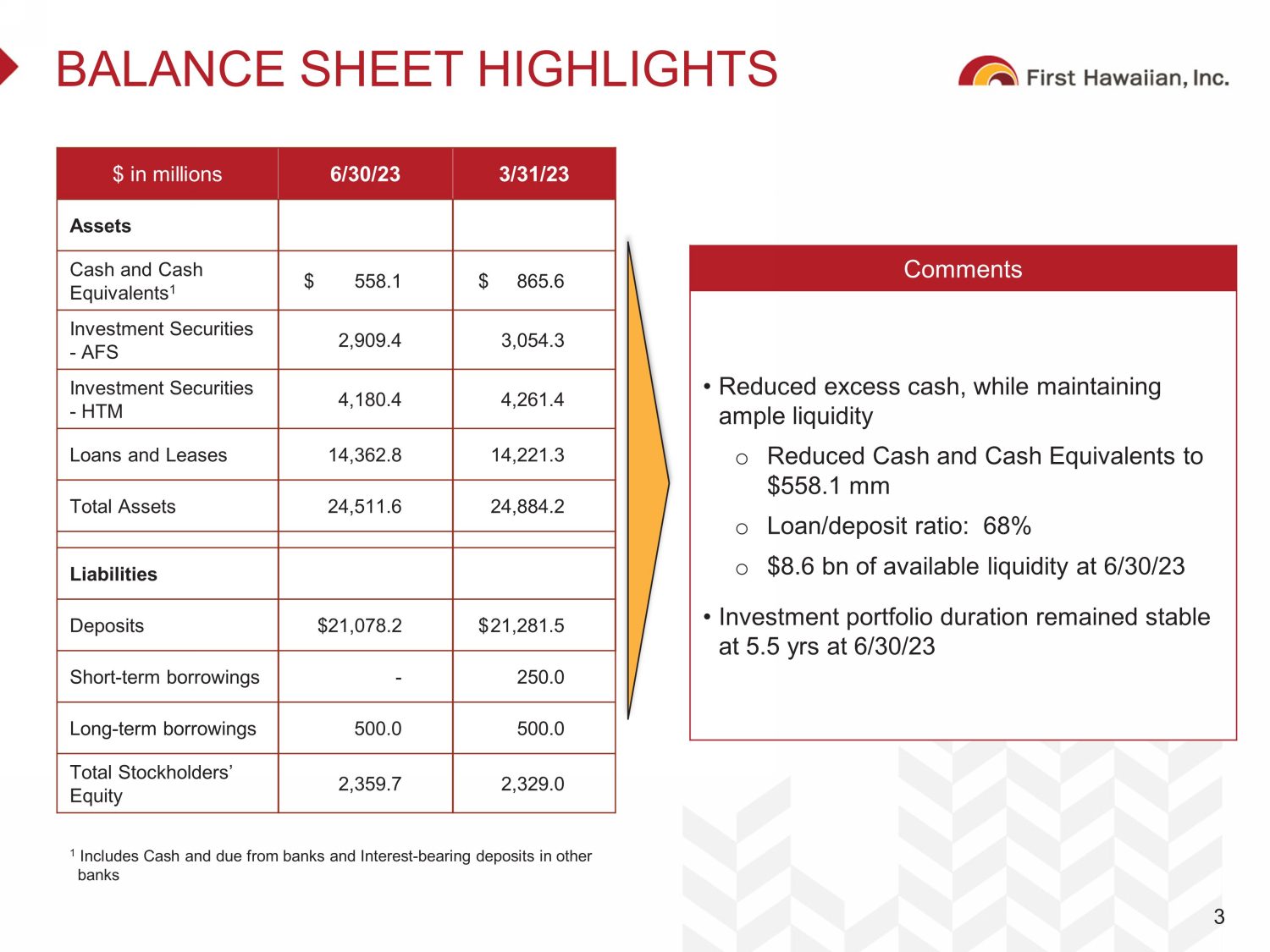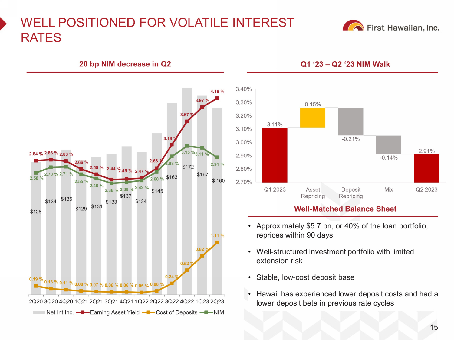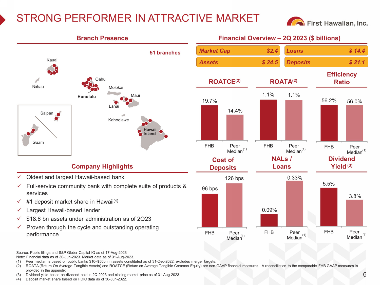 DISCLAIMER Forward - Looking Statements This presentation contains, and from time - to - time in connection with this presentation our management may make, forward - looking statements within the meaning of the Private Securities Litigation Reform Act of 1995. These forward - looking statements reflect our views at such time with respect to, among other things, future events and our financial performance. These statements are often, but not always , m ade through the use of words or phrases such as “may,” “might,” “should,” “could,” “predict,” “potential,” “believe,” “expect,” “continu e,” “will,” “anticipate,” “seek,” “estimate,” “intend,” “plan,” “projection,” “would,” “annualized,” and “outlook,” or the negative version of these w ord s or other comparable words or phrases of a future or forward - looking nature. These forward - looking statements are not historical facts an d are based on current expectations, estimates and projections about our industry, management’s beliefs and certain assumptions made by m ana gement, and any such forward - looking statements are subject to risks, assumptions, estimates and uncertainties that are difficult to pre dict. Actual results may prove to be materially different from the results expressed or implied by the forward - looking statements. Factors th at could cause our actual results to differ materially from those described in the forward - looking statements, including (without limitation) t he domestic and global economic environment and capital market conditions and other risk factors, can be found in our SEC filings, including, bu t not limited to, our Annual Report on Form 10 - K for the year ended December 31, 2022, and our Quarterly Reports on Form 10 - Q for the quarters end ed March 31 and June 30, 2023, which are available on our website (www.fhb.com) and the SEC’s website (www.sec.gov). Any forward - lo oking statement speaks only as of the date on which it is made, and we do not undertake any obligation to update or review any forw ard - looking statement, whether as a result of new information, future developments or otherwise, except as required by applicable law. Use of Non - GAAP Financial Measures The information provided herein includes certain non - GAAP financial measures. We believe that these measures provide useful inf ormation about our operating results and enhance the overall understanding of our past performance and future performance. Although t hes e non - GAAP financial measures are frequently used by stakeholders in the evaluation of a company, they have limitations as analytic al tools and should not be considered in isolation or as a substitute for analysis of our results or financial condition as reported under GA AP. Investors should consider our performance and financial condition as reported under GAAP and all other relevant information when assess ing our performance or financial condition. The reconciliation of such measures to the comparable GAAP figures are included in the a ppe ndix of this presentation. Other References to “we,” “us,” “our,” “FHI,” “FHB,” “Company,” and “First Hawaiian” refer to First Hawaiian, Inc. and its consolid ate d subsidiaries. 1