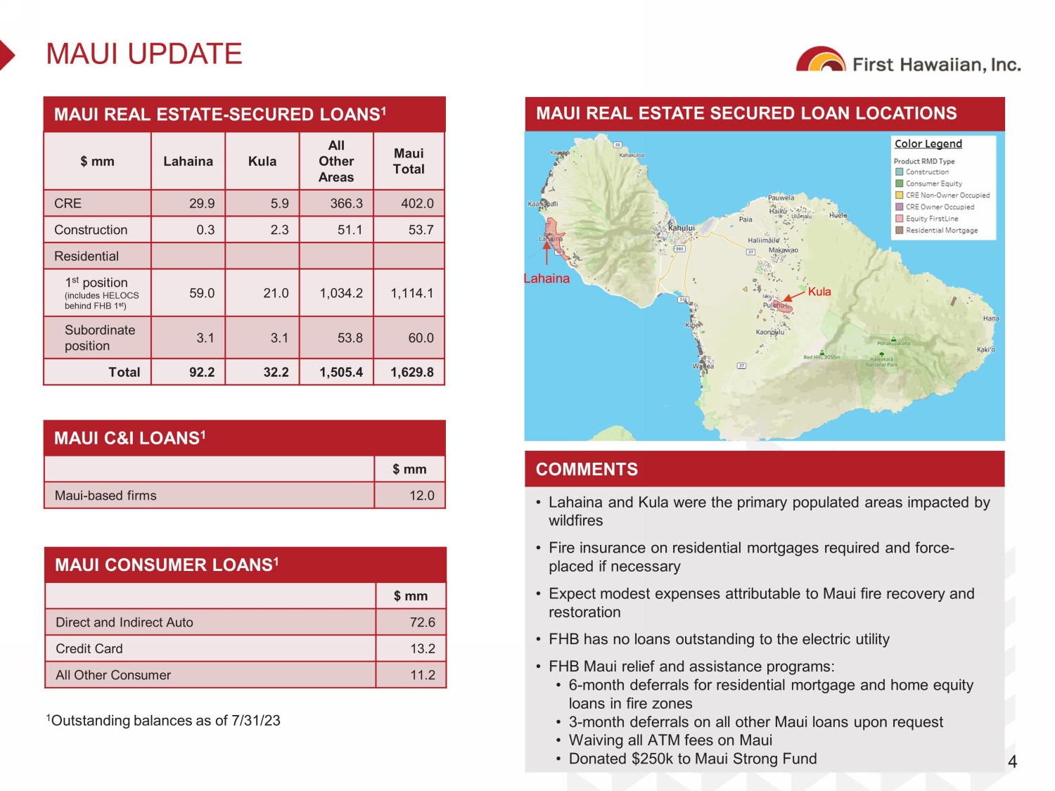 MAUI UPDATE 4 MAUI REAL ESTATE - SECURED LOANS 1 $ mm Lahaina Kula All Other Areas Maui Total CRE 29.9 5.9 366.3 402.0 Construction 0.3 2.3 51.1 53.7 Residential 1 st position (includes HELOCS behind FHB 1 st ) 59.0 21.0 1,034.2 1,114.1 Subordinate position 3.1 3.1 53.8 60.0 Total 92.2 32.2 1,505.4 1,629.8 COMMENTS • Lahaina and Kula were the primary populated areas impacted by wildfires • Fire insurance on residential mortgages required and force - placed if necessary • Expect modest expenses attributable to Maui fire recovery and restoration • FHB has no loans outstanding to the electric utility • FHB Maui relief and assistance programs: • 6 - month deferrals for residential mortgage and home equity loans in fire zones • 3 - month deferrals on all other Maui loans upon request • Waiving all ATM fees on Maui • Donated $250k to Maui Strong Fund MAUI REAL ESTATE SECURED LOAN LOCATIONS MAUI C&I LOANS 1 $ mm Maui - based firms 12.0 MAUI CONSUMER LOANS 1 $ mm Direct and Indirect Auto 72.6 Credit Card 13.2 All Other Consumer 11.2 Lahaina Kula 1 Outstanding balances as of 7/31/23