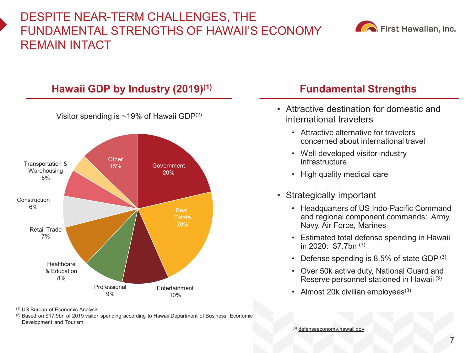 NALs / Loans 56.2% 56.0% FHB Peer Median 19.7% 14.4% FHB Peer Median STRONG PERFORMER IN ATTRACTIVE MARKET 6 Branch Presence Financial Overview – 2Q 2023 ($ billions) Source: Public filings and S&P Global Capital IQ as of 17 - Aug - 2023 Note: Financial data as of 30 - Jun - 2023. Market data as of 31 - Aug - 2023. (1) Peer median is based on public banks $10 – $50bn in assets constituted as of 31 - Dec - 2022; excludes merger targets. (2) ROATA (Return On Average Tangible Assets) and ROATCE (Return on Average Tangible Common Equity) are non - GAAP financial measures. A reconciliation to the comparable FHB GAAP measures is provided in the appendix. (3) Dividend yield based on dividend paid in 2Q 2023 and closing market price as of 31 - Aug - 2023. (4) Deposit market share based on FDIC data as of 30 - Jun - 2022. Company Highlights x Oldest and largest Hawaii - based bank x Full - service community bank with complete suite of products & services x #1 deposit market share in Hawaii (4) x Largest Hawaii - based lender x $18.6 bn assets under administration as of 2Q23 x Proven through the cycle and outstanding operating performance Efficiency Ratio ROATCE (2) Dividend Yield (3) Maui Kahoolawe Lanai Oahu Kauai Niihau Honolulu Hawaii Island Molokai 0.09% 0.33% FHB Peer Median Market Cap $2.4 Loans $ 14.4 Assets $ 24.5 Deposits $ 21.1 Guam Saipan (1) (1) (1) (1) 96 bps 126 bps FHB Peer Median Cost of Deposits (1) 1.1% 1.1% FHB Peer Median ROATA (2) (1) 51 branches 5.5% 3.8% FHB Peer Median (1)