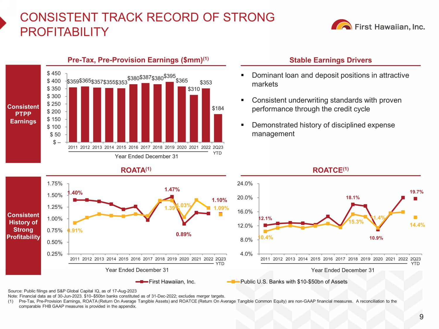 $9.1 $21.1 '07 '08 '09 '10 '11 '12 '13 '14 '15 '16 '17 '18 '19 '20 '21 22 2Q23 Source: Public filings and S&P Global Capital IQ as of 17 - Aug - 2023 Note: Financial data as of 30 - Jun - 2023. $10 – $50bn banks constituted as of 31 - Dec - 2022; excludes merger targets. (1) ROATCE (Return on Average Tangible Common Equity) is a non - GAAP financial measure. A reconciliation to the comparable FHB GAAP measure is provided in the appendix. 12.1% 18.1% 19.7% 10.4% 14.4% 8.0% 10.0% 12.0% 14.0% 16.0% 18.0% 20.0% 22.0% '11 '12 '13 '14 '15 '16 '17 '18 '19 '20 '21 '22 2Q23 46.5% 56.2% 61.4% 56.0% 40.0% 45.0% 50.0% 55.0% 60.0% 65.0% 70.0% '11 '12 '13 '14 '15 '16 '17 '18 '19 '20 '21 '22 2Q23 STRONG PERFORMANCE THROUGH THE CYCLE 8 Through the Cycle Credit Performer Strong Expense Mgmt. Culture Strong Profitability Consistent Deposit Growth ($ bn ) Steady, Balanced Loan Growth ($ bn ) $6.5 $14.4 '07 '08 '09 '10 '11 '12 '13 '14 '15 '16 '17 '18 '19 '20 '21 '22 2Q23 NPAs + 90s / Loans + OREO Efficiency Ratio ROATCE (1) 2Q23 Cost of Deposits: 1.11% First Hawaiian, Inc. Public U.S. Banks with $10-$50bn of Assets 0.16% 0.60% 0.11% 0.40% 3.10% 0.42% 0.00% 0.50% 1.00% 1.50% 2.00% 2.50% 3.00% 3.50% '06 '07 '08 '09 '10 '11 '12 '13 '14 '15 '16 '17 '18 '19 '20 '21 '22 2Q23 YTD YTD