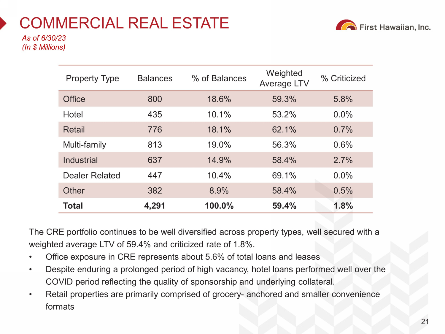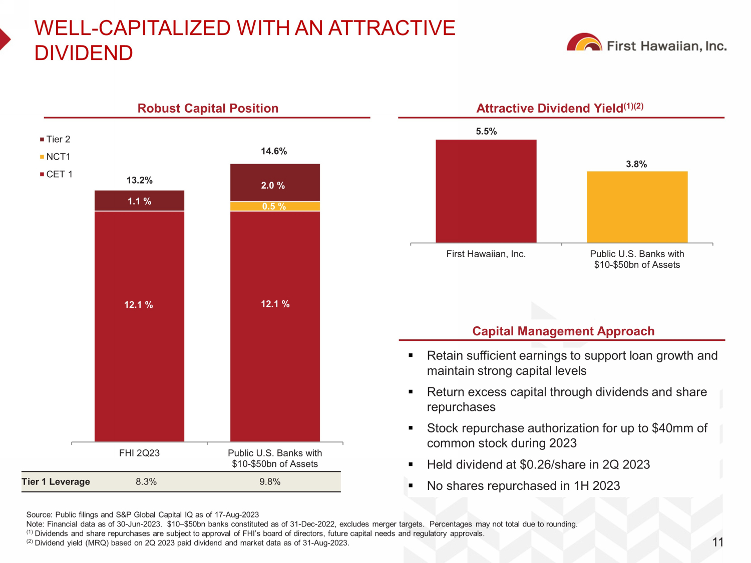 0.21% 0.73% 0.10% 0.10% 0.95% 0.08% 0.00% 0.50% 1.00% 1.50% '06 '07 '08 '09 '10 '11 '12 '13 '14 '15 '16 '17 '18 '19 '20 '21 '22 2Q23 PROVEN, CONSISTENT, AND CONSERVATIVE CREDIT RISK MANAGEMENT Strong through the cycle credit performance driven by conservative approach to credit risk management 10 Year Ended December 31 0.16% 0.63% 0.11% 0.39% 3.10% 0.42% 0.00% 0.50% 1.00% 1.50% 2.00% 2.50% 3.00% 3.50% As of December 31 1.43% 1.03% 1.18% 1.97% 1.11% 0.00% 0.50% 1.00% 1.50% 2.00% 2.50% 71.4x 11.2x 3.7x 3.3x As of December 31 As of December 31 First Hawaiian, Inc. Public U.S. Banks with $10-$50bn of Assets Source: Public filings and SNL Financial, available as of 17 - Aug - 2023 Note: Financial data as of 30 - Jun - 2023. $10 – $50bn banks constituted as of 31 - Dec - 2022; excludes merger targets. NCOs / Average Loans NPAs + 90s / Loans + OREO Reserves / Loans Reserves / Non - Accrual Loans 75.0x 20.0x 10.0x YTD
