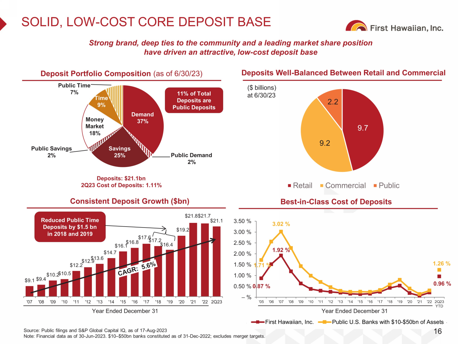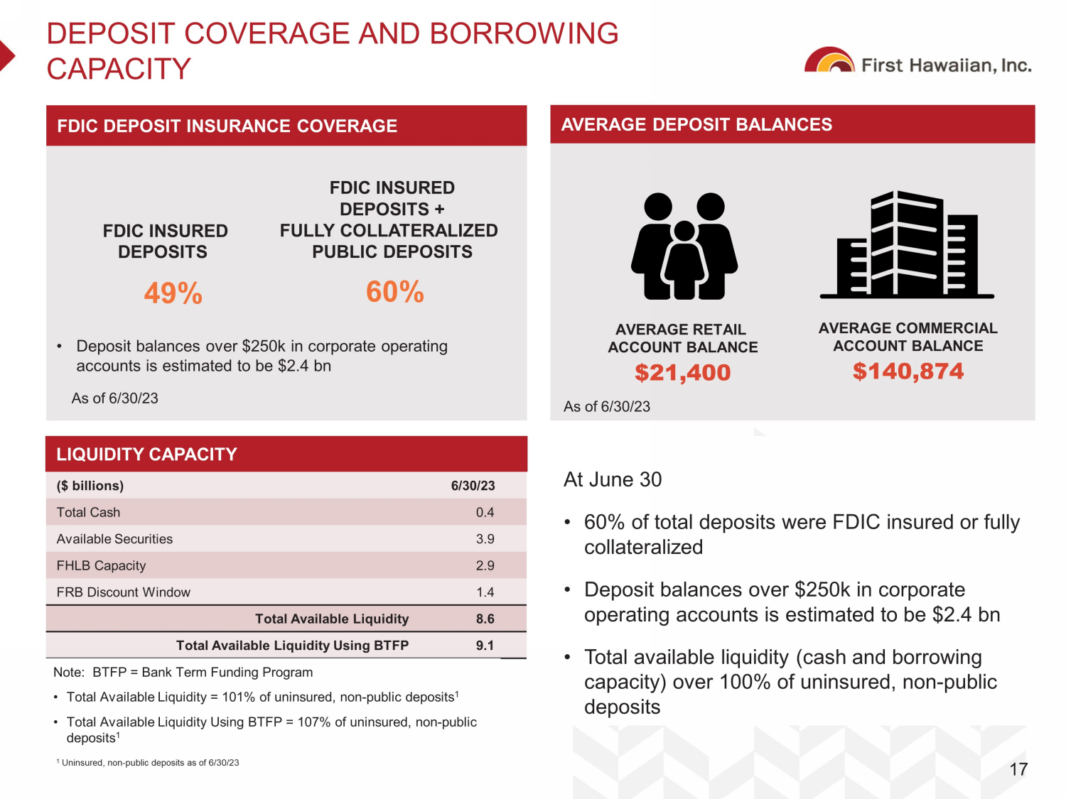$9.1 $9.4 $10.2 $10.5 $12.2 $12.9 $13.6 $14.7 $16.1 $16.8 $17.6 $17.2 $16.4 $19.2 $21.8 $21.7 $21.1 '07 '08 '09 '10 '11 '12 '13 '14 '15 '16 '17 '18 '19 '20 '21 '22 2Q23 Demand 37% Money Market 18% Savings 25% Time 9% SOLID, LOW - COST CORE DEPOSIT BASE Strong brand, deep ties to the community and a leading market share position have driven an attractive, low - cost deposit base Deposits: $21.1bn 2Q23 Cost of Deposits: 1.11% Year Ended December 31 Deposit Portfolio Composition (as of 6/30/23) Consistent Deposit Growth ($bn) Best - in - Class Cost of Deposits 0.87 % 1.92 % 0.96 % 1.71 % 3.02 % 1.26 % – % 0.50 % 1.00 % 1.50 % 2.00 % 2.50 % 3.00 % 3.50 % '05 '06 '07 '08 '09 '10 '11 '12 '13 '14 '15 '16 '17 '18 '19 '20 '21 '22 2Q23 YTD First Hawaiian, Inc. Public U.S. Banks with $10-$50bn of Assets Year Ended December 31 Source: Public filings and S&P Global Capital IQ, as of 17 - Aug - 2023 Note: Financial data as of 30 - Jun - 2023. $10 – $50bn banks constituted as of 31 - Dec - 2022; excludes merger targets. 11% of Total Deposits are Public Deposits Public Savings 2% Reduced Public Time Deposits by $1.5 bn in 2018 and 2019 Public Time 7% Deposits Well - Balanced Between Retail and Commercial 16 Public Demand 2% 9.7 9.2 2.2 Retail Commercial Public ($ billions) at 6/30/23