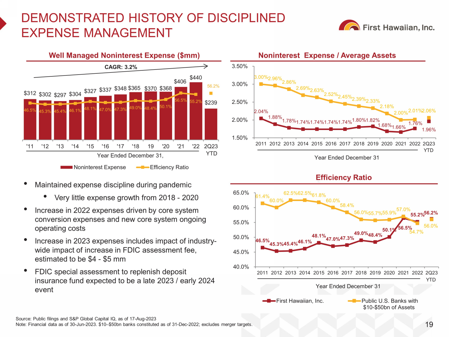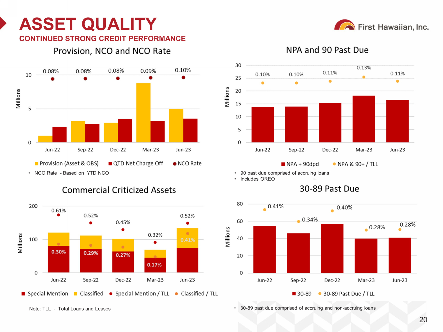 $312 $302 $297 $304 $327 $337 $348 $365 $370 $368 $406 $440 $239 46.5% 45.3% 45.4% 46.1% 48.1% 47.0% 47.3% 49.0% 48.4% 50.1% 56.5% 55.2% 56.2% '11 '12 '13 '14 '15 '16 '17 '18 19 '20 '21 '22 2Q23 Noninterest Expense Efficiency Ratio 46.5% 45.3% 45.4% 46.1% 48.1% 47.0% 47.3% 49.0% 48.4% 50.1% 56.5% 55.2% 56.2% 61.4% 60.0% 62.5% 62.5% 61.8% 60.0% 58.4% 56.0% 55.7% 55.9% 57.0% 54.7% 56.0% 40.0% 45.0% 50.0% 55.0% 60.0% 65.0% 2011 2012 2013 2014 2015 2016 2017 2018 2019 2020 2021 2022 2Q23 First Hawaiian, Inc. Public U.S. Banks with $10-$50bn of Assets 2.04% 1.88% 1.78% 1.74% 1.74% 1.74% 1.74% 1.80% 1.82% 1.68% 1.66% 1.76% 1.96% 3.00% 2.96% 2.86% 2.69% 2.63% 2.52% 2.45% 2.39% 2.33% 2.18% 2.00% 2.01% 2.06% 1.50% 2.00% 2.50% 3.00% 3.50% 2011 2012 2013 2014 2015 2016 2017 2018 2019 2020 2021 2022 2Q23 DEMONSTRATED HISTORY OF DISCIPLINED EXPENSE MANAGEMENT 19 Source: Public filings and S&P Global Capital IQ, as of 17 - Aug - 2023 Note: Financial data as of 30 - Jun - 2023. $10 – $50bn banks constituted as of 31 - Dec - 2022; excludes merger targets. Year Ended December 31 Year Ended December 31 Noninterest Expense / Average Assets Well Managed Noninterest Expense ($mm) Efficiency Ratio • Maintained expense discipline during pandemic • Very little expense growth from 2018 - 2020 • Increase in 2022 expenses driven by core system conversion expenses and new core system ongoing operating costs • Increase in 2023 expenses includes impact of industry - wide impact of increase in FDIC assessment fee, estimated to be $4 - $5 mm • FDIC special assessment to replenish deposit insurance fund expected to be a late 2023 / early 2024 event CAGR: 3.2% Year Ended December 31, YTD YTD YTD
