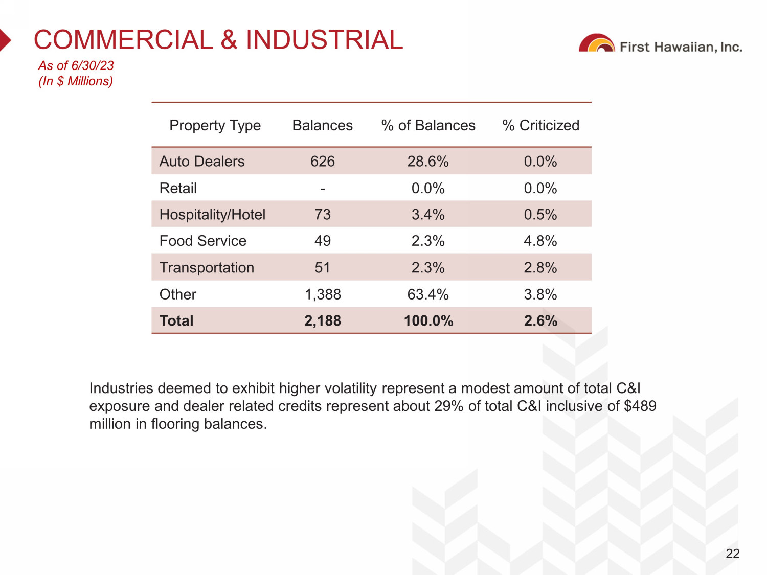 COMMERCIAL REAL ESTATE 21 As of 6/30/23 (In $ Millions) The CRE portfolio continues to be well diversified across property types, well secured with a weighted average LTV of 59.4% and criticized rate of 1.8%. • Office exposure in CRE represents about 5.6% of total loans and leases • Despite enduring a prolonged period of high vacancy, hotel loans performed well over the COVID period reflecting the quality of sponsorship and underlying collateral. • Retail properties are primarily comprised of grocery - anchored and smaller convenience formats Property Type Balances % of Balances Weighted Average LTV % Criticized Office 800 18.6% 59.3% 5.8% Hotel 435 10.1% 53.2% 0.0% Retail 776 18.1% 62.1% 0.7% Multi - family 813 19.0% 56.3% 0.6% Industrial 637 14.9% 58.4% 2.7% Dealer Related 447 10.4% 69.1% 0.0% Other 382 8.9% 58.4% 0.5% Total 4,291 100.0% 59.4% 1.8%