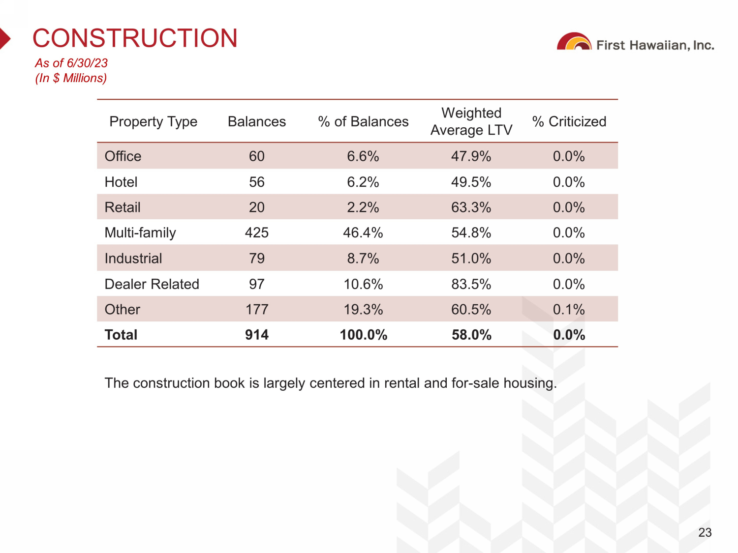 CONSTRUCTION 23 As of 6/30/23 (In $ Millions) The construction book is largely centered in rental and for - sale housing. Property Type Balances % of Balances Weighted Average LTV % Criticized Office 60 6.6% 47.9% 0.0% Hotel 56 6.2% 49.5% 0.0% Retail 20 2.2% 63.3% 0.0% Multi - family 425 46.4% 54.8% 0.0% Industrial 79 8.7% 51.0% 0.0% Dealer Related 97 10.6% 83.5% 0.0% Other 177 19.3% 60.5% 0.1% Total 914 100.0% 58.0% 0.0%