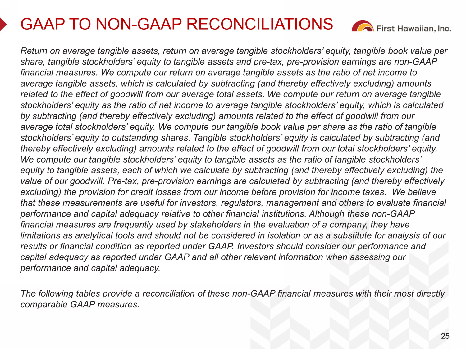 GAAP TO NON - GAAP RECONCILIATIONS Return on average tangible assets, return on average tangible stockholders’ equity, tangible book value per share, tangible stockholders’ equity to tangible assets and pre - tax, pre - provision earnings are non - GAAP financial measures. We compute our return on average tangible assets as the ratio of net income to average tangible assets, which is calculated by subtracting (and thereby effectively excluding) amounts related to the effect of goodwill from our average total assets. We compute our return on average tangible stockholders’ equity as the ratio of net income to average tangible stockholders’ equity, which is calculated by subtracting (and thereby effectively excluding) amounts related to the effect of goodwill from our average total stockholders’ equity. We compute our tangible book value per share as the ratio of tangible stockholders’ equity to outstanding shares. Tangible stockholders’ equity is calculated by subtracting (and thereby effectively excluding) amounts related to the effect of goodwill from our total stockholders’ equity. We compute our tangible stockholders’ equity to tangible assets as the ratio of tangible stockholders’ equity to tangible assets, each of which we calculate by subtracting (and thereby effectively excluding) the value of our goodwill. Pre - tax, pre - provision earnings are calculated by subtracting (and thereby effectively excluding) the provision for credit losses from our income before provision for income taxes. We believe that these measurements are useful for investors, regulators, management and others to evaluate financial performance and capital adequacy relative to other financial institutions. Although these non - GAAP financial measures are frequently used by stakeholders in the evaluation of a company, they have limitations as analytical tools and should not be considered in isolation or as a substitute for analysis of our results or financial condition as reported under GAAP. Investors should consider our performance and capital adequacy as reported under GAAP and all other relevant information when assessing our performance and capital adequacy. The following tables provide a reconciliation of these non - GAAP financial measures with their most directly comparable GAAP measures. 25