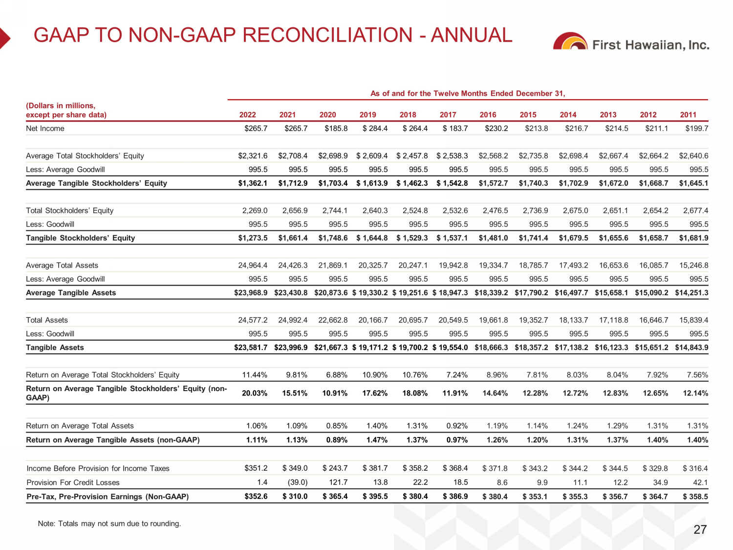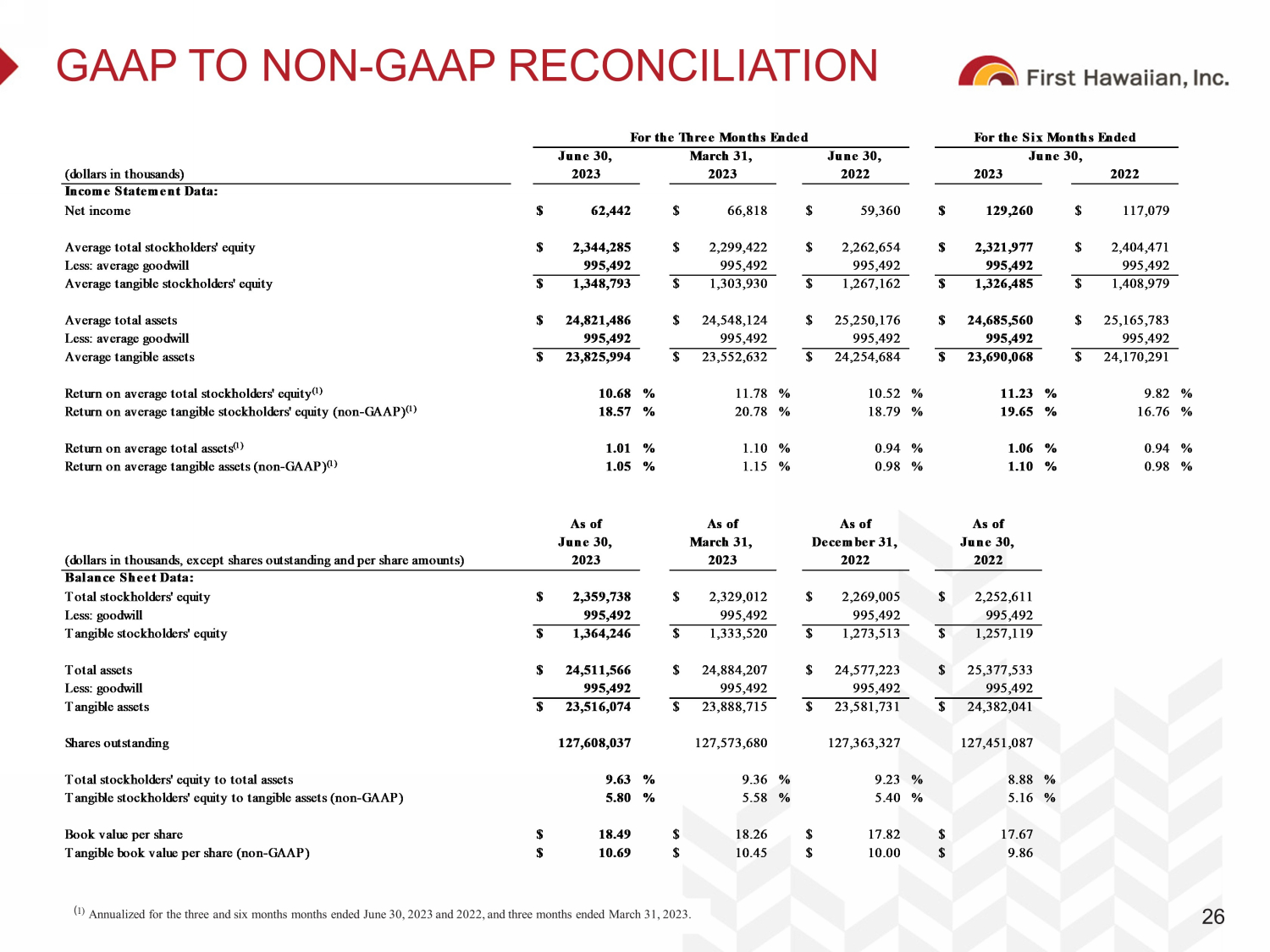 GAAP TO NON - GAAP RECONCILIATION 26 ( 1) Annualized for the three and six months months ended June 30, 2023 and 2022, and three months ended March 31, 2023. (dollars in thousands)                          Income Statement Data: Net income $ 62,442 $ 66,818 $ 59,360 $ 129,260 $ 117,079 Average total stockholders' equity $ 2,344,285 $ 2,299,422 $ 2,262,654 $ 2,321,977 $ 2,404,471 Less: average goodwill 995,492 995,492 995,492 995,492 995,492 Average tangible stockholders' equity $ 1,348,793 $ 1,303,930 $ 1,267,162 $ 1,326,485 $ 1,408,979 Average total assets $ 24,821,486 $ 24,548,124 $ 25,250,176 $ 24,685,560 $ 25,165,783 Less: average goodwill 995,492 995,492 995,492 995,492 995,492 Average tangible assets $ 23,825,994 $ 23,552,632 $ 24,254,684 $ 23,690,068 $ 24,170,291 Return on average total stockholders' equity(1) 10.68 %   11.78 %   10.52 %   11.23 %   9.82 %   Return on average tangible stockholders' equity (non-GAAP)(1) 18.57 %   20.78 %   18.79 %   19.65 %   16.76 %   Return on average total assets(1) 1.01 %   1.10 %   0.94 %   1.06 %   0.94 %   Return on average tangible assets (non-GAAP)(1) 1.05 %   1.15 %   0.98 %   1.10 %   0.98 %   (dollars in thousands, except shares outstanding and per share amounts)                Balance Sheet Data: Total stockholders' equity $ 2,359,738 $ 2,329,012 $ 2,269,005 $ 2,252,611 Less: goodwill 995,492 995,492 995,492 995,492 Tangible stockholders' equity $ 1,364,246 $ 1,333,520 $ 1,273,513 $ 1,257,119 Total assets $ 24,511,566 $ 24,884,207 $ 24,577,223 $ 25,377,533 Less: goodwill 995,492 995,492 995,492 995,492 Tangible assets $ 23,516,074 $ 23,888,715 $ 23,581,731 $ 24,382,041 Shares outstanding 127,608,037 127,573,680 127,363,327 127,451,087 Total stockholders' equity to total assets 9.63 %   9.36 %   9.23 %   8.88 % 5.80 %   5.58 %   5.40 %   5.16 % Book value per share $ 18.49 $ 18.26 $ 17.82 $ 17.67 Tangible book value per share (non-GAAP) $ 10.69 $ 10.45 $ 10.00 $ 9.86 2022 Tangible stockholders' equity to tangible assets (non-GAAP) As of As of As of As of June 30,  March 31,  December 31,  June 30,  2023 2023 2022 2023 2023 2022 2023 2022 For the Three Months Ended For the Six Months Ended June 30,  March 31,  June 30,  June 30,
