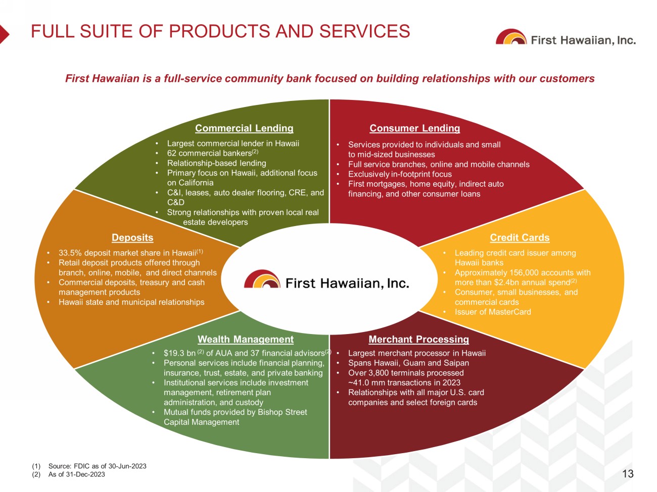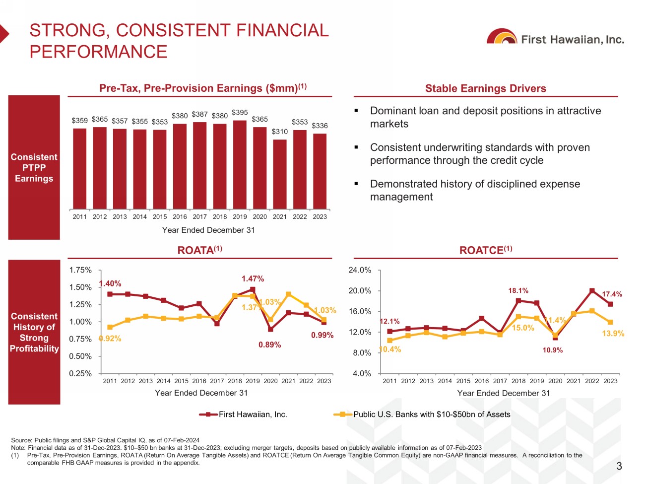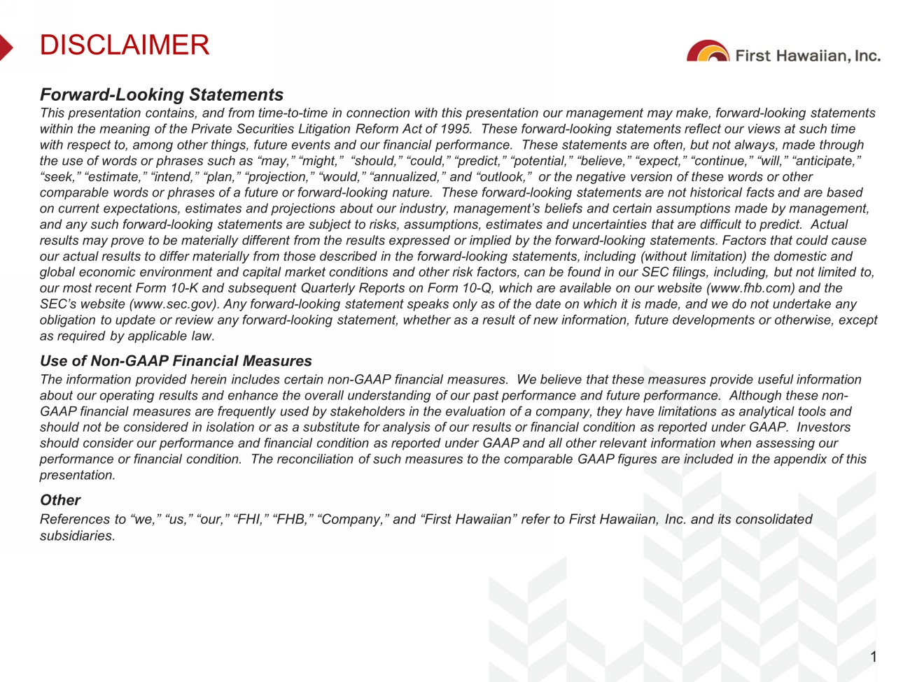 DISCLAIMER Forward - Looking Statements This presentation contains, and from time - to - time in connection with this presentation our management may make, forward - looking statements within the meaning of the Private Securities Litigation Reform Act of 1995. These forward - looking statements reflect our views at such time with respect to, among other things, future events and our financial performance. These statements are often, but not always , m ade through the use of words or phrases such as “may,” “might,” “should,” “could,” “predict,” “potential,” “believe,” “expect,” “continu e,” “will,” “anticipate,” “seek,” “estimate,” “intend,” “plan,” “projection,” “would,” “annualized,” and “outlook,” or the negative version of these w ord s or other comparable words or phrases of a future or forward - looking nature. These forward - looking statements are not historical facts an d are based on current expectations, estimates and projections about our industry, management’s beliefs and certain assumptions made by m ana gement, and any such forward - looking statements are subject to risks, assumptions, estimates and uncertainties that are difficult to pre dict. Actual results may prove to be materially different from the results expressed or implied by the forward - looking statements. Factors th at could cause our actual results to differ materially from those described in the forward - looking statements, including (without limitation) t he domestic and global economic environment and capital market conditions and other risk factors, can be found in our SEC filings, including, bu t not limited to, our most recent Form 10 - K and subsequent Quarterly Reports on Form 10 - Q, which are available on our website (www.fhb.com) and th e SEC’s website (www.sec.gov). Any forward - looking statement speaks only as of the date on which it is made, and we do not underta ke any obligation to update or review any forward - looking statement, whether as a result of new information, future developments or oth erwise, except as required by applicable law. Use of Non - GAAP Financial Measures The information provided herein includes certain non - GAAP financial measures. We believe that these measures provide useful inf ormation about our operating results and enhance the overall understanding of our past performance and future performance. Although t hes e non - GAAP financial measures are frequently used by stakeholders in the evaluation of a company, they have limitations as analytic al tools and should not be considered in isolation or as a substitute for analysis of our results or financial condition as reported under GA AP. Investors should consider our performance and financial condition as reported under GAAP and all other relevant information when assess ing our performance or financial condition. The reconciliation of such measures to the comparable GAAP figures are included in the a ppe ndix of this presentation. Other References to “we,” “us,” “our,” “FHI,” “FHB,” “Company,” and “First Hawaiian” refer to First Hawaiian, Inc. and its consolid ate d subsidiaries. 1
