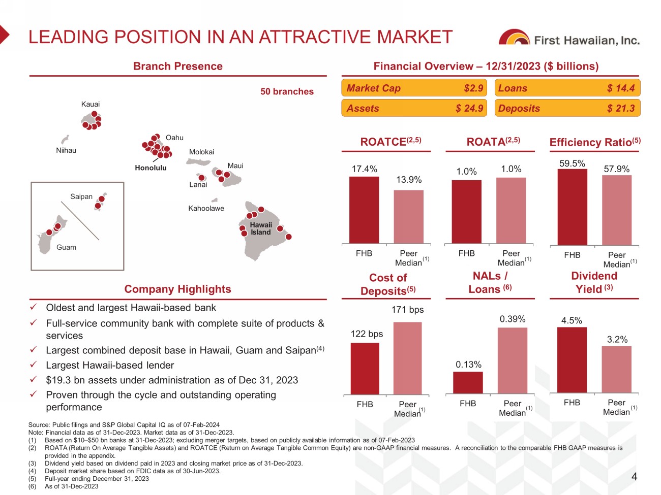 $359 $365 $357 $355 $353 $380 $387 $380 $395 $365 $310 $353 $336 2011 2012 2013 2014 2015 2016 2017 2018 2019 2020 2021 2022 2023 1.40% 1.47% 0.89% 0.99% 0.92% 1.37% 1.03% 1.03% 0.25% 0.50% 0.75% 1.00% 1.25% 1.50% 1.75% 2011 2012 2013 2014 2015 2016 2017 2018 2019 2020 2021 2022 2023 STRONG, CONSISTENT FINANCIAL PERFORMANCE 3 Source: Public filings and S&P Global Capital IQ, as of 07 - Feb - 2024 Note: Financial data as of 31 - Dec - 2023. $10 – $50 bn banks at 31 - Dec - 2023; excluding merger targets, deposits based on publicly av ailable information as of 07 - Feb - 2023 (1) Pre - Tax, Pre - Provision Earnings, ROATA (Return On Average Tangible Assets) and ROATCE (Return On Average Tangible Common Equity) are non - GAAP financial measures. A reconciliation to the comparable FHB GAAP measures is provided in the appendix. 12.1% 18.1% 10.9% 17.4% 10.4% 15.0% 11.4% 13.9% 4.0% 8.0% 12.0% 16.0% 20.0% 24.0% 2011 2012 2013 2014 2015 2016 2017 2018 2019 2020 2021 2022 2023 Pre - Tax, Pre - Provision Earnings ($mm) (1) ROATA (1) Stable Earnings Drivers ROATCE (1) Year Ended December 31 Consistent PTPP Earnings Consistent History of Strong Profitability First Hawaiian, Inc. Public U.S. Banks with $10-$50bn of Assets Year Ended December 31 ▪ Dominant loan and deposit positions in attractive markets ▪ Consistent underwriting standards with proven performance through the credit cycle ▪ Demonstrated history of disciplined expense management Year Ended December 31