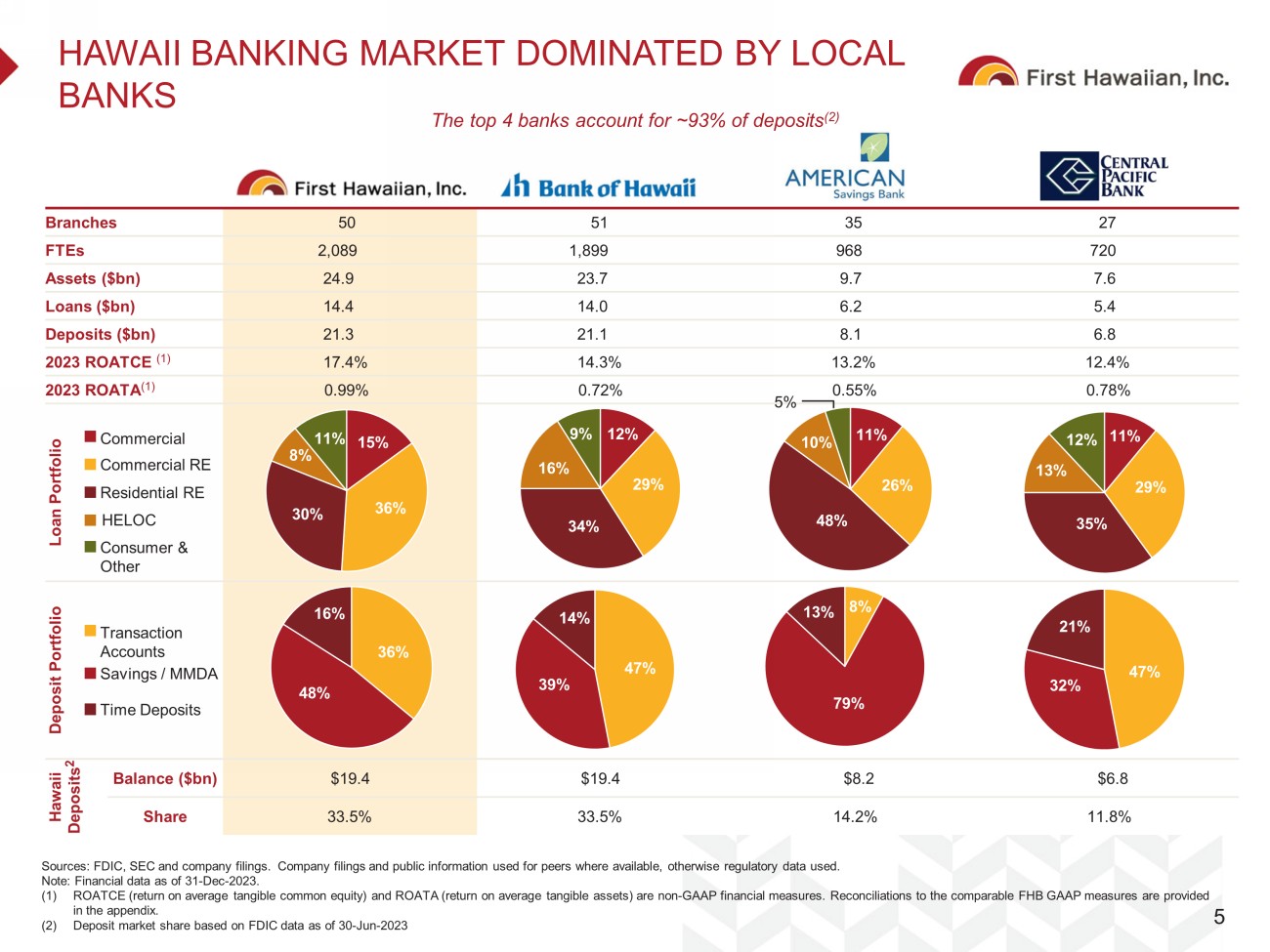 NALs / Loans (6) 59.5% 57.9% FHB Peer Median 17.4% 13.9% FHB Peer Median LEADING POSITION IN AN ATTRACTIVE MARKET 4 Branch Presence Financial Overview – 12/31/2023 ($ billions) Source: Public filings and S&P Global Capital IQ as of 07 - Feb - 2024 Note: Financial data as of 31 - Dec - 2023. Market data as of 31 - Dec - 2023. (1) Based on $10 – $50 bn banks at 31 - Dec - 2023; excluding merger targets, based on publicly available information as of 07 - Feb - 2023 (2) ROATA (Return On Average Tangible Assets) and ROATCE (Return on Average Tangible Common Equity) are non - GAAP financial measures. A reconciliation to the comparable FHB GAAP measures is provided in the appendix. (3) Dividend yield based on dividend paid in 2023 and closing market price as of 31 - Dec - 2023. (4) Deposit market share based on FDIC data as of 30 - Jun - 2023. (5) Full - year ending December 31, 2023 (6) As of 31 - Dec - 2023 Company Highlights x Oldest and largest Hawaii - based bank x Full - service community bank with complete suite of products & services x Largest combined deposit base in Hawaii, Guam and Saipan (4) x Largest Hawaii - based lender x $19.3 bn assets under administration as of Dec 31, 2023 x Proven through the cycle and outstanding operating performance Efficiency Ratio (5) ROATCE (2,5) Dividend Yield (3) Maui Kahoolawe Lanai Oahu Kauai Niihau Honolulu Hawaii Island Molokai 0.13% 0.39% FHB Peer Median Market Cap $2.9 Loans $ 14.4 Assets $ 24.9 Deposits $ 21.3 Guam Saipan (1) (1) (1) (1) 122 bps 171 bps FHB Peer Median Cost of Deposits (5) (1) 1.0% 1.0% FHB Peer Median ROATA (2,5) (1) 50 branches 4.5% 3.2% FHB Peer Median (1)
