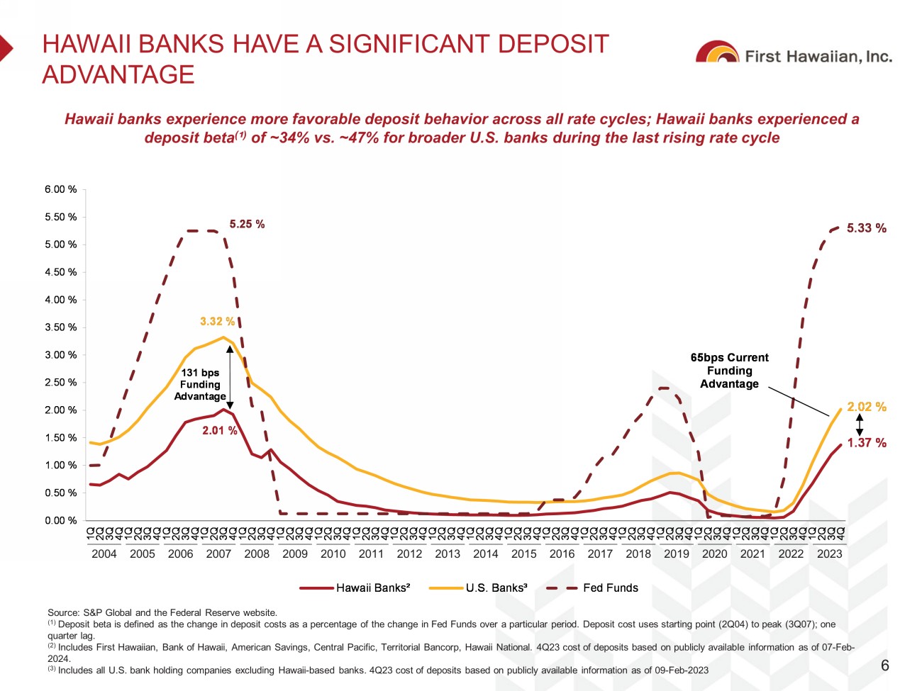 HAWAII BANKING MARKET DOMINATED BY LOCAL BANKS 5 The top 4 banks account for ~93% of deposits (2) Sources: FDIC, SEC and company filings. Company filings and public information used for peers where available, otherwise reg ula tory data used. Note: Financial data as of 31 - Dec - 2023. (1) ROATCE (return on average tangible common equity) and ROATA (return on average tangible assets) are non - GAAP financial measures. Reconciliations to the comparable FHB GAAP measures are provided in the appendix. (2) Deposit market share based on FDIC data as of 30 - Jun - 2023 Branches 50 51 35 27 FTEs 2,089 1,899 968 720 Assets ($bn) 24.9 23.7 9.7 7.6 Loans ($bn) 14.4 14.0 6.2 5.4 Deposits ($bn) 21.3 21.1 8.1 6.8 2023 ROATCE (1) 17.4% 14.3% 13.2% 12.4% 2023 ROATA (1) 0.99% 0.72% 0.55% 0.78% Loan Portfolio Deposit Portfolio Hawaii Deposits 2 Balance ($bn) $19.4 $19.4 $8.2 $6.8 Share 33.5% 33.5% 14.2% 11.8 % Commercial Commercial RE Residential RE Consumer & Other Transaction Accounts Savings / MMDA Time Deposits 11% 15% 36% 30% 9% 12% 29% 34% 16% 5 % 11% 26% 48% 10% 12% 11% 29% 35% 13% 16% 36% 48% 14% 47% 39% 8% 79% 13% 21% 47% 32% 8% HELOC