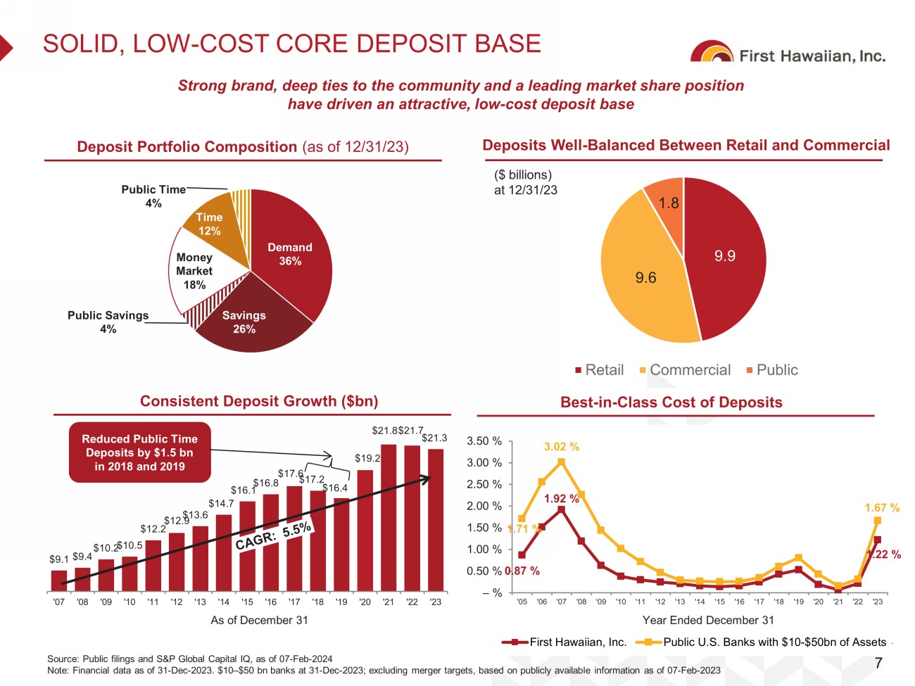 HAWAII BANKS HAVE A SIGNIFICANT DEPOSIT ADVANTAGE 6 Source: S&P Global and the Federal Reserve website. (1) Deposit beta is defined as the change in deposit costs as a percentage of the change in Fed Funds over a particular period. D ep osit cost uses starting point (2Q04) to peak (3Q07); one quarter lag. (2) Includes First Hawaiian, Bank of Hawaii, American Savings, Central Pacific, Territorial Bancorp, Hawaii National. 4Q23 cost o f deposits based on publicly available information as of 07 - Feb - 2024. (3) Includes all U.S. bank holding companies excluding Hawaii - based banks. 4Q23 cost of deposits based on publicly available inform ation as of 09 - Feb - 2023 Hawaii banks experience more favorable deposit behavior across all rate cycles; Hawaii banks experienced a deposit beta ( ¹ ) of ~34% vs. ~47% for broader U.S. banks during the last rising rate cycle 2004 2005 2006 2007 2008 2009 2010 2011 2012 2013 2014 2015 2016 2017 2018 2019 2020 2021 2022 2023 1.37 % 2.02 % 5.33 % 0.00 % 0.50 % 1.00 % 1.50 % 2.00 % 2.50 % 3.00 % 3.50 % 4.00 % 4.50 % 5.00 % 5.50 % 6.00 % 1Q 2Q 3Q 4Q 1Q 2Q 3Q 4Q 1Q 2Q 3Q 4Q 1Q 2Q 3Q 4Q 1Q 2Q 3Q 4Q 1Q 2Q 3Q 4Q 1Q 2Q 3Q 4Q 1Q 2Q 3Q 4Q 1Q 2Q 3Q 4Q 1Q 2Q 3Q 4Q 1Q 2Q 3Q 4Q 1Q 2Q 3Q 4Q 1Q 2Q 3Q 4Q 1Q 2Q 3Q 4Q 1Q 2Q 3Q 4Q 1Q 2Q 3Q 4Q 1Q 2Q 3Q 4Q 1Q 2Q 3Q 4Q 1Q 2Q 3Q 4Q 1Q 2Q 3Q 4Q Hawaii Banks² U.S. Banks³ Fed Funds 65bps Current Funding Advantage 3.32 % 2.01 % 5.25 % 131 bps Funding Advantage