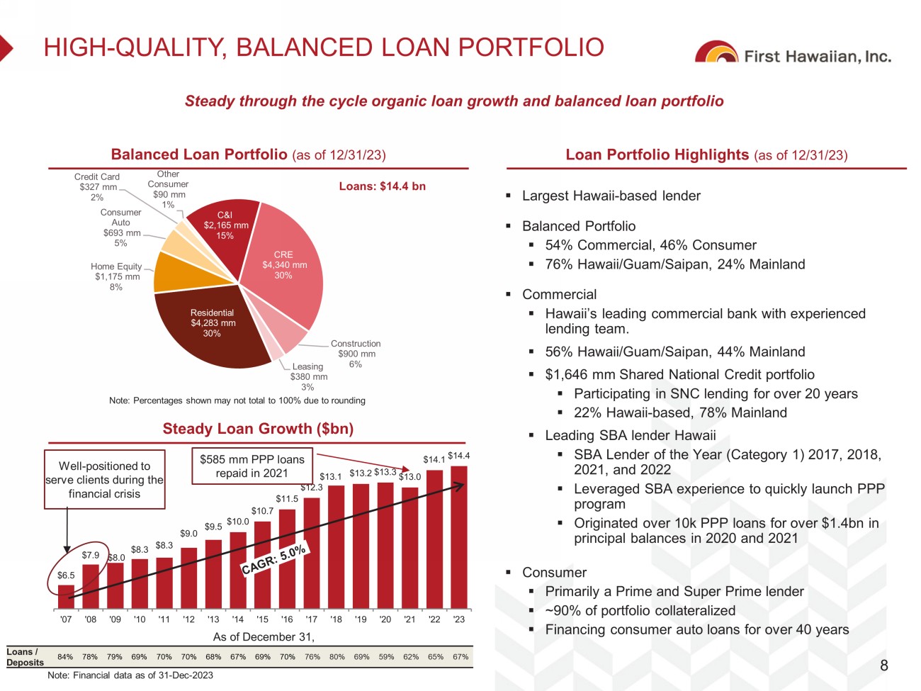 $9.1 $9.4 $10.2 $10.5 $12.2 $12.9 $13.6 $14.7 $16.1 $16.8 $17.6 $17.2 $16.4 $19.2 $21.8 $21.7 $21.3 '07 '08 '09 '10 '11 '12 '13 '14 '15 '16 '17 '18 '19 '20 '21 '22 '23 Demand 36% Money Market 18% Savings 26% Time 12% SOLID, LOW - COST CORE DEPOSIT BASE Strong brand, deep ties to the community and a leading market share position have driven an attractive, low - cost deposit base As of December 31 Deposit Portfolio Composition (as of 12/31/23) Consistent Deposit Growth ($bn) Best - in - Class Cost of Deposits 0.87 % 1.92 % 1.22 % 1.71 % 3.02 % 1.67 % – % 0.50 % 1.00 % 1.50 % 2.00 % 2.50 % 3.00 % 3.50 % '05 '06 '07 '08 '09 '10 '11 '12 '13 '14 '15 '16 '17 '18 '19 '20 '21 '22 '23 First Hawaiian, Inc. Public U.S. Banks with $10-$50bn of Assets Year Ended December 31 Source: Public filings and S&P Global Capital IQ, as of 07 - Feb - 2024 Note: Financial data as of 31 - Dec - 2023. $10 – $50 bn banks at 31 - Dec - 2023; excluding merger targets, based on publicly available i nformation as of 07 - Feb - 2023 Public Savings 4% Reduced Public Time Deposits by $1.5 bn in 2018 and 2019 Public Time 4% Deposits Well - Balanced Between Retail and Commercial 7 9.9 9.6 1.8 Retail Commercial Public ($ billions) at 12/31/23