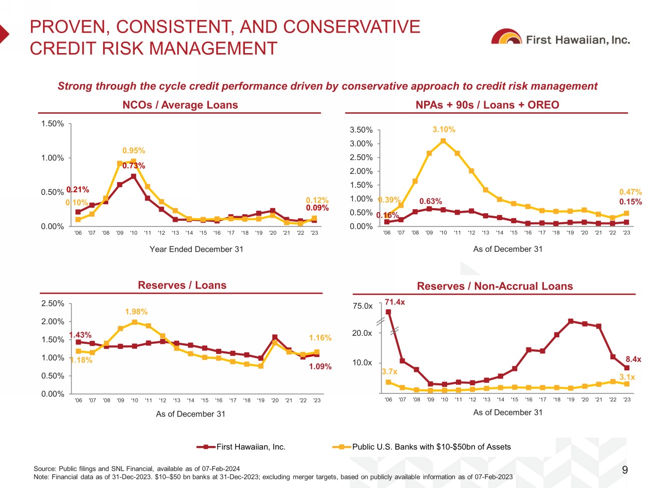 $6.5 $7.9 $8.0 $8.3 $8.3 $9.0 $9.5 $10.0 $10.7 $11.5 $12.3 $13.1 $13.2 $13.3 $13.0 $14.1 $14.4 '07 '08 '09 '10 '11 '12 '13 '14 '15 '16 '17 '18 '19 '20 '21 '22 '23 HIGH - QUALITY, BALANCED LOAN PORTFOLIO Steady through the cycle organic loan growth and balanced loan portfolio 8 Well - positioned to serve clients during the financial crisis Loans: $14.4 bn Loans / Deposits 84% 78% 79% 69% 70% 70% 68% 67% 69% 70% 76% 80% 69% 59% 62% 65% 67% As of December 31, Balanced Loan Portfolio (as of 12/31/23) Steady Loan Growth ($bn) Note: Financial data as of 31 - Dec - 2023 ▪ Largest Hawaii - based lender ▪ Balanced Portfolio ▪ 54% Commercial, 46% Consumer ▪ 76 % Hawaii/Guam/Saipan, 24% Mainland ▪ Commercial ▪ Hawaii’s leading commercial bank with experienced lending team. ▪ 56 % Hawaii/Guam/Saipan, 44% Mainland ▪ $ 1,646 mm Shared National Credit portfolio ▪ Participating in SNC lending for over 20 years ▪ 22 % Hawaii - based, 78% Mainland ▪ Leading SBA lender Hawaii ▪ SBA Lender of the Year (Category 1) 2017, 2018, 2021, and 2022 ▪ Leveraged SBA experience to quickly launch PPP program ▪ Originated over 10k PPP loans for over $1.4bn in principal balances in 2020 and 2021 ▪ Consumer ▪ Primarily a Prime and Super Prime lender ▪ ~90% of portfolio collateralized ▪ Financing consumer auto loans for over 40 years C&I $2,165 mm 15% CRE $4,340 mm 30% Construction $900 mm 6% Leasing $380 mm 3% Residential $4,283 mm 30% Home Equity $1,175 mm 8% Consumer Auto $693 mm 5% Credit Card $327 mm 2% Other Consumer $90 mm 1% Loan Portfolio Highlights (as of 12/31/23) $585 mm PPP loans repaid in 2021 Note: Percentages shown may not total to 100% due to rounding