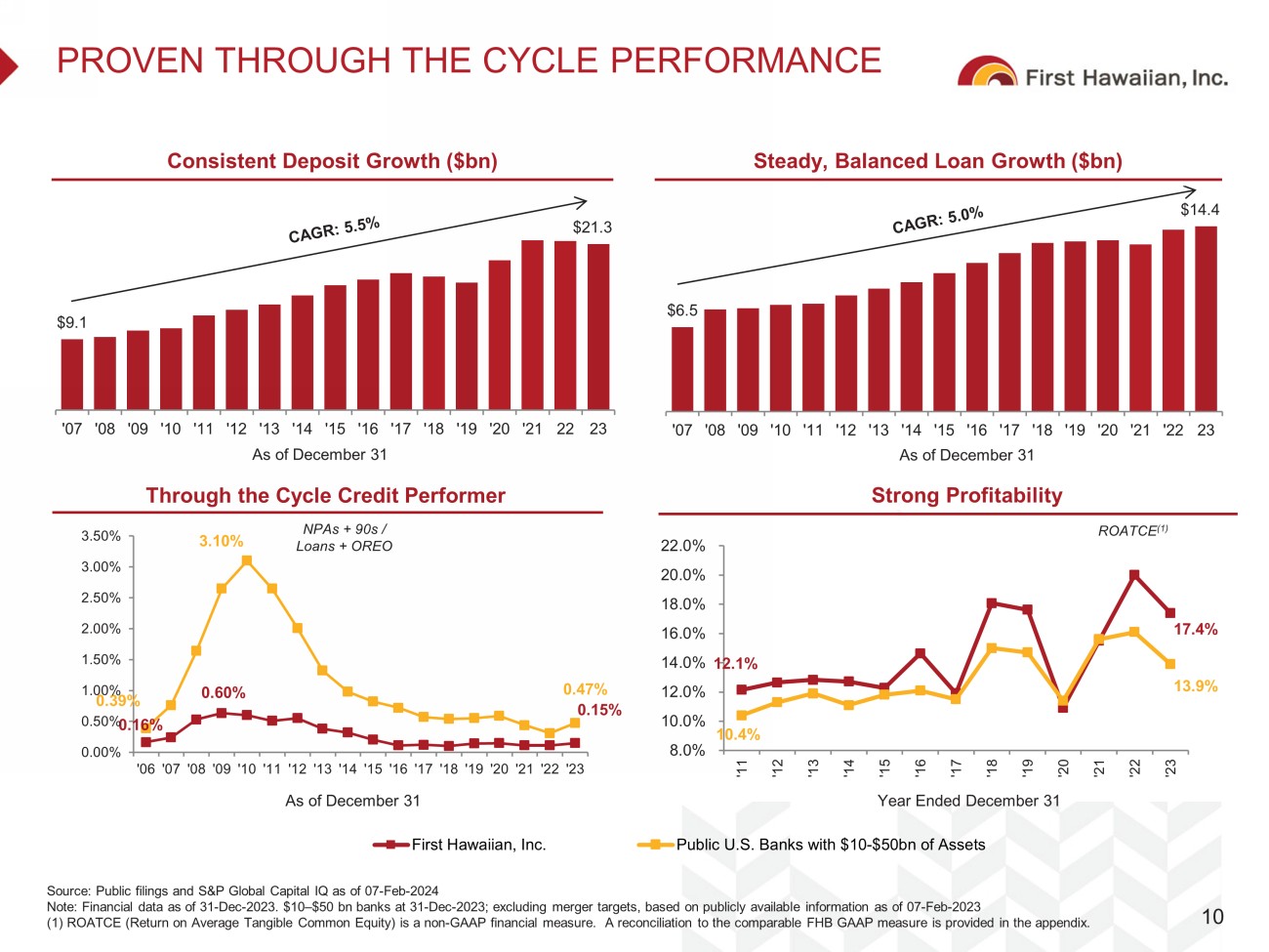 0.21% 0.73% 0.09% 0.10% 0.95% 0.12% 0.00% 0.50% 1.00% 1.50% '06 '07 '08 '09 '10 '11 '12 '13 '14 '15 '16 '17 '18 '19 '20 '21 '22 '23 PROVEN, CONSISTENT, AND CONSERVATIVE CREDIT RISK MANAGEMENT Strong through the cycle credit performance driven by conservative approach to credit risk management 9 Year Ended December 31 0.16% 0.63% 0.15% 0.39% 3.10% 0.47% 0.00% 0.50% 1.00% 1.50% 2.00% 2.50% 3.00% 3.50% '06 '07 '08 '09 '10 '11 '12 '13 '14 '15 '16 '17 '18 '19 '20 '21 '22 '23 As of December 31 1.43% 1.09% 1.18% 1.98% 1.16% 0.00% 0.50% 1.00% 1.50% 2.00% 2.50% '06 '07 '08 '09 '10 '11 '12 '13 '14 '15 '16 '17 '18 '19 '20 '21 '22 '23 71.4x 8.4x 3.7x 3.1x '06 '07 '08 '09 '10 '11 '12 '13 '14 '15 '16 '17 '18 '19 '20 '21 '22 '23 As of December 31 As of December 31 First Hawaiian, Inc. Public U.S. Banks with $10-$50bn of Assets Source: Public filings and SNL Financial, available as of 07 - Feb - 2024 Note: Financial data as of 31 - Dec - 2023. $10 – $50 bn banks at 31 - Dec - 2023; excluding merger targets, based on publicly available i nformation as of 07 - Feb - 2023 NCOs / Average Loans NPAs + 90s / Loans + OREO Reserves / Loans Reserves / Non - Accrual Loans 75.0x 20.0x 10.0x