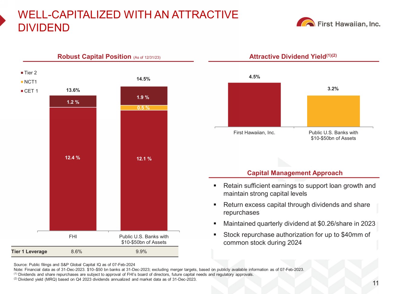 $9.1 $21.3 '07 '08 '09 '10 '11 '12 '13 '14 '15 '16 '17 '18 '19 '20 '21 22 23 Source: Public filings and S&P Global Capital IQ as of 07 - Feb - 2024 Note: Financial data as of 31 - Dec - 2023. $10 – $50 bn banks at 31 - Dec - 2023; excluding merger targets, based on publicly available i nformation as of 07 - Feb - 2023 (1) ROATCE (Return on Average Tangible Common Equity) is a non - GAAP financial measure. A reconciliation to the comparable FHB G AAP measure is provided in the appendix. 12.1% 17.4% 10.4% 13.9% 8.0% 10.0% 12.0% 14.0% 16.0% 18.0% 20.0% 22.0% '11 '12 '13 '14 '15 '16 '17 '18 '19 '20 '21 '22 '23 PROVEN THROUGH THE CYCLE PERFORMANCE 10 Through the Cycle Credit Performer Strong Profitability Consistent Deposit Growth ($ bn ) Steady, Balanced Loan Growth ($ bn ) $6.5 $14.4 '07 '08 '09 '10 '11 '12 '13 '14 '15 '16 '17 '18 '19 '20 '21 '22 23 NPAs + 90s / Loans + OREO ROATCE (1) First Hawaiian, Inc. Public U.S. Banks with $10-$50bn of Assets 0.16% 0.60% 0.15% 0.39% 3.10% 0.47% 0.00% 0.50% 1.00% 1.50% 2.00% 2.50% 3.00% 3.50% '06 '07 '08 '09 '10 '11 '12 '13 '14 '15 '16 '17 '18 '19 '20 '21 '22 '23 As of December 31 As of December 31 Year Ended December 31 As of December 31