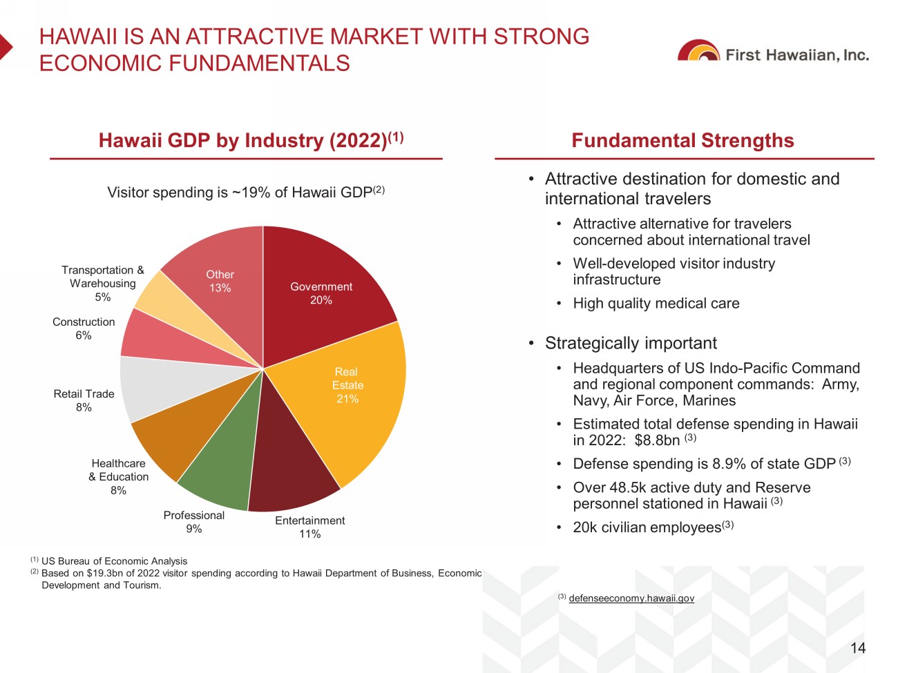 FULL SUITE OF PRODUCTS AND SERVICES 13 • Largest commercial lender in Hawaii • 62 commercial bankers (2) • Relationship - based lending • Primary focus on Hawaii, additional focus on California • C&I, leases, auto dealer flooring, CRE, and C&D • Strong relationships with proven local real estate developers • $19.3 bn (2) of AUA and 37 financial advisors (2) • Personal services include financial planning, insurance, trust, estate, and private banking • Institutional services include investment management, retirement plan administration, and custody • Mutual funds provided by Bishop Street Capital Management • 33.5% deposit market share in Hawaii (1) • Retail deposit products offered through branch, online, mobile, and direct channels • Commercial deposits, treasury and cash management products • Hawaii state and municipal relationships Commercial Lending Wealth Management Deposits • Services provided to individuals and small to mid - sized businesses • Full service branches, online and mobile channels • Exclusively in - footprint focus • First mortgages, home equity, indirect auto financing, and other consumer loans Consumer Lending • Leading credit card issuer among Hawaii banks • Approximately 156,000 accounts with more than $2.4bn annual spend (2) • Consumer, small businesses, and commercial cards • Issuer of M asterCard Credit Cards • Largest merchant processor in Hawaii • Spans Hawaii, Guam and Saipan • Over 3,800 terminals processed ~41.0 mm transactions in 2023 • Relationships with all major U.S. card companies and select foreign cards Merchant Processing First Hawaiian is a full - service community bank focused on building relationships with our customers (1) Source: FDIC as of 30 - Jun - 2023 (2) As of 31 - Dec - 2023