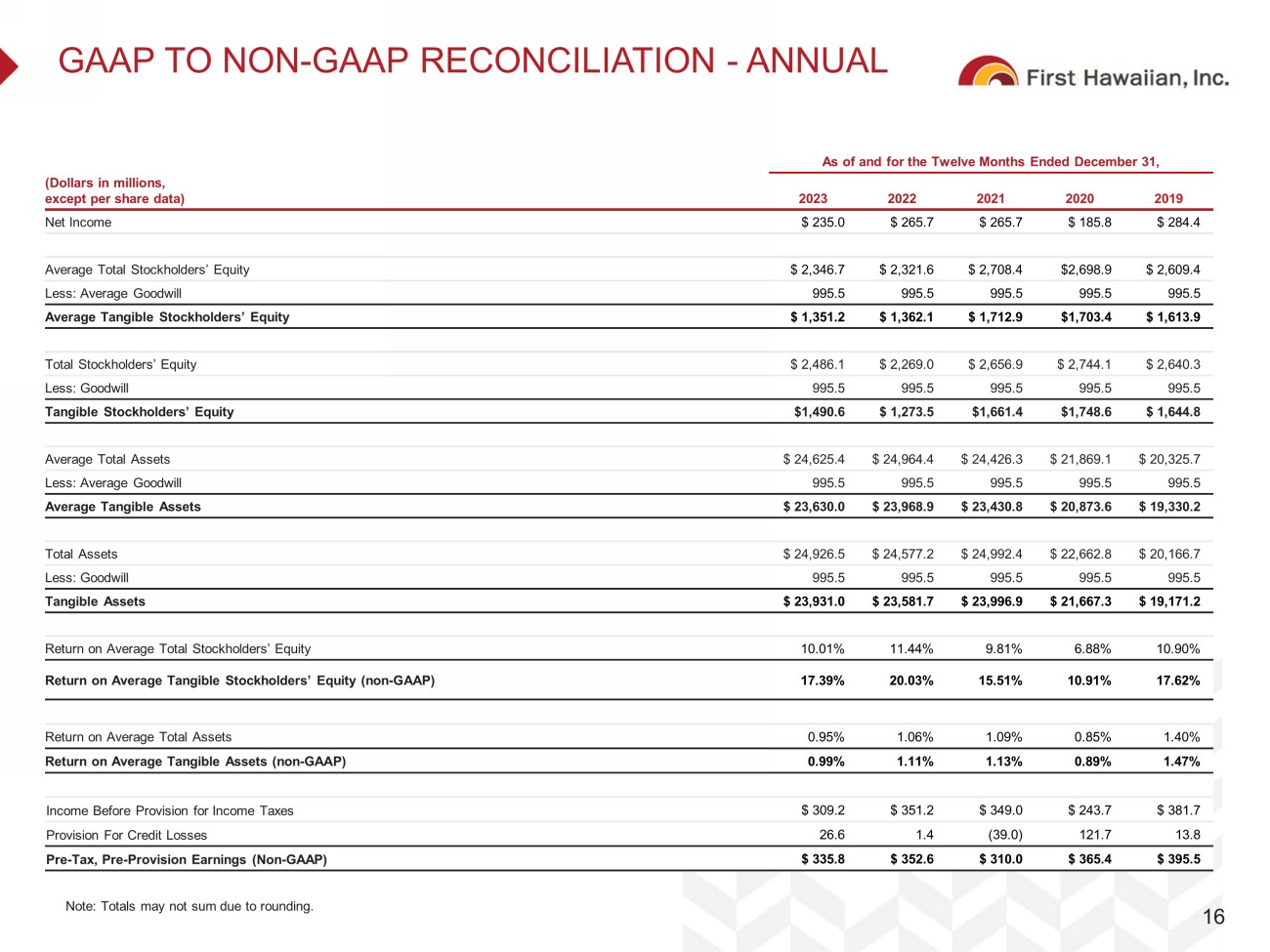GAAP TO NON - GAAP RECONCILIATION - ANNUAL 16 Note: Totals may not sum due to rounding. As of and for the Twelve Months Ended December 31, (Dollars in millions, except per share data) 2023 2022 2021 2020 2019 Net Income $ 235.0 $ 265.7 $ 265.7 $ 185.8 $ 284.4 Average Total Stockholders’ Equity $ 2,346.7 $ 2,321.6 $ 2,708.4 $2,698.9 $ 2,609.4 Less: Average Goodwill 995.5 995.5 995.5 995.5 995.5 Average Tangible Stockholders’ Equity $ 1,351.2 $ 1,362.1 $ 1,712.9 $1,703.4 $ 1,613.9 Total Stockholders’ Equity $ 2,486.1 $ 2,269.0 $ 2,656.9 $ 2,744.1 $ 2,640.3 Less: Goodwill 995.5 995.5 995.5 995.5 995.5 Tangible Stockholders’ Equity $1,490.6 $ 1,273.5 $1,661.4 $1,748.6 $ 1,644.8 Average Total Assets $ 24,625.4 $ 24,964.4 $ 24,426.3 $ 21,869.1 $ 20,325.7 Less: Average Goodwill 995.5 995.5 995.5 995.5 995.5 Average Tangible Assets $ 23,630.0 $ 23,968.9 $ 23,430.8 $ 20,873.6 $ 19,330.2 Total Assets $ 24,926.5 $ 24,577.2 $ 24,992.4 $ 22,662.8 $ 20,166.7 Less: Goodwill 995.5 995.5 995.5 995.5 995.5 Tangible Assets $ 23,931.0 $ 23,581.7 $ 23,996.9 $ 21,667.3 $ 19,171.2 Return on Average Total Stockholders’ Equity 10.01% 11.44% 9.81% 6.88% 10.90% Return on Average Tangible Stockholders’ Equity (non - GAAP) 17.39% 20.03% 15.51% 10.91% 17.62% Return on Average Total Assets 0.95% 1.06% 1.09% 0.85% 1.40% Return on Average Tangible Assets (non - GAAP) 0.99% 1.11% 1.13% 0.89% 1.47% Income Before Provision for Income Taxes $ 309.2 $ 351.2 $ 349.0 $ 243.7 $ 381.7 Provision For Credit Losses 26.6 1.4 (39.0) 121.7 13.8 Pre - Tax, Pre - Provision Earnings (Non - GAAP) $ 335.8 $ 352.6 $ 310.0 $ 365.4 $ 395.5