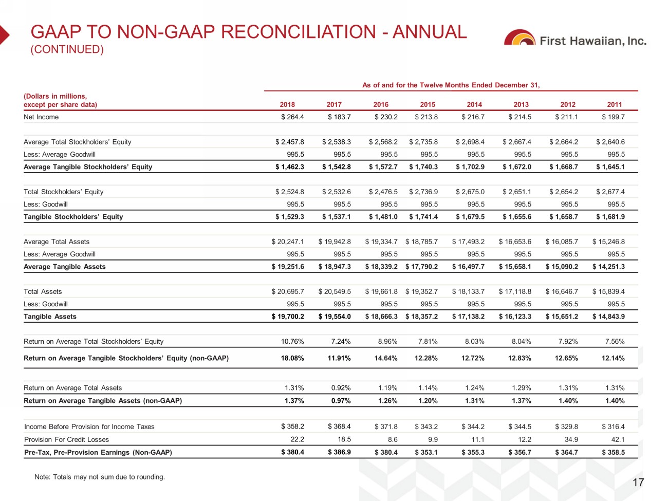 GAAP TO NON - GAAP RECONCILIATION - ANNUAL (CONTINUED) 17 Note: Totals may not sum due to rounding. As of and for the Twelve Months Ended December 31, (Dollars in millions, except per share data) 2018 2017 2016 2015 2014 2013 2012 2011 Net Income $ 264.4 $ 183.7 $ 230.2 $ 213.8 $ 216.7 $ 214.5 $ 211.1 $ 199.7 Average Total Stockholders’ Equity $ 2,457.8 $ 2,538.3 $ 2,568.2 $ 2,735.8 $ 2,698.4 $ 2,667.4 $ 2,664.2 $ 2,640.6 Less: Average Goodwill 995.5 995.5 995.5 995.5 995.5 995.5 995.5 995.5 Average Tangible Stockholders’ Equity $ 1,462.3 $ 1,542.8 $ 1,572.7 $ 1,740.3 $ 1,702.9 $ 1,672.0 $ 1,668.7 $ 1,645.1 Total Stockholders’ Equity $ 2,524.8 $ 2,532.6 $ 2,476.5 $ 2,736.9 $ 2,675.0 $ 2,651.1 $ 2,654.2 $ 2,677.4 Less: Goodwill 995.5 995.5 995.5 995.5 995.5 995.5 995.5 995.5 Tangible Stockholders’ Equity $ 1,529.3 $ 1,537.1 $ 1,481.0 $ 1,741.4 $ 1,679.5 $ 1,655.6 $ 1,658.7 $ 1,681.9 Average Total Assets $ 20,247.1 $ 19,942.8 $ 19,334.7 $ 18,785.7 $ 17,493.2 $ 16,653.6 $ 16,085.7 $ 15,246.8 Less: Average Goodwill 995.5 995.5 995.5 995.5 995.5 995.5 995.5 995.5 Average Tangible Assets $ 19,251.6 $ 18,947.3 $ 18,339.2 $ 17,790.2 $ 16,497.7 $ 15,658.1 $ 15,090.2 $ 14,251.3 Total Assets $ 20,695.7 $ 20,549.5 $ 19,661.8 $ 19,352.7 $ 18,133.7 $ 17,118.8 $ 16,646.7 $ 15,839.4 Less: Goodwill 995.5 995.5 995.5 995.5 995.5 995.5 995.5 995.5 Tangible Assets $ 19,700.2 $ 19,554.0 $ 18,666.3 $ 18,357.2 $ 17,138.2 $ 16,123.3 $ 15,651.2 $ 14,843.9 Return on Average Total Stockholders’ Equity 10.76% 7.24% 8.96% 7.81% 8.03% 8.04% 7.92% 7.56% Return on Average Tangible Stockholders’ Equity (non - GAAP) 18.08% 11.91% 14.64% 12.28% 12.72% 12.83% 12.65% 12.14% Return on Average Total Assets 1.31% 0.92% 1.19% 1.14% 1.24% 1.29% 1.31% 1.31% Return on Average Tangible Assets (non - GAAP) 1.37% 0.97% 1.26% 1.20% 1.31% 1.37% 1.40% 1.40% Income Before Provision for Income Taxes $ 358.2 $ 368.4 $ 371.8 $ 343.2 $ 344.2 $ 344.5 $ 329.8 $ 316.4 Provision For Credit Losses 22.2 18.5 8.6 9.9 11.1 12.2 34.9 42.1 Pre - Tax, Pre - Provision Earnings (Non - GAAP) $ 380.4 $ 386.9 $ 380.4 $ 353.1 $ 355.3 $ 356.7 $ 364.7 $ 358.5