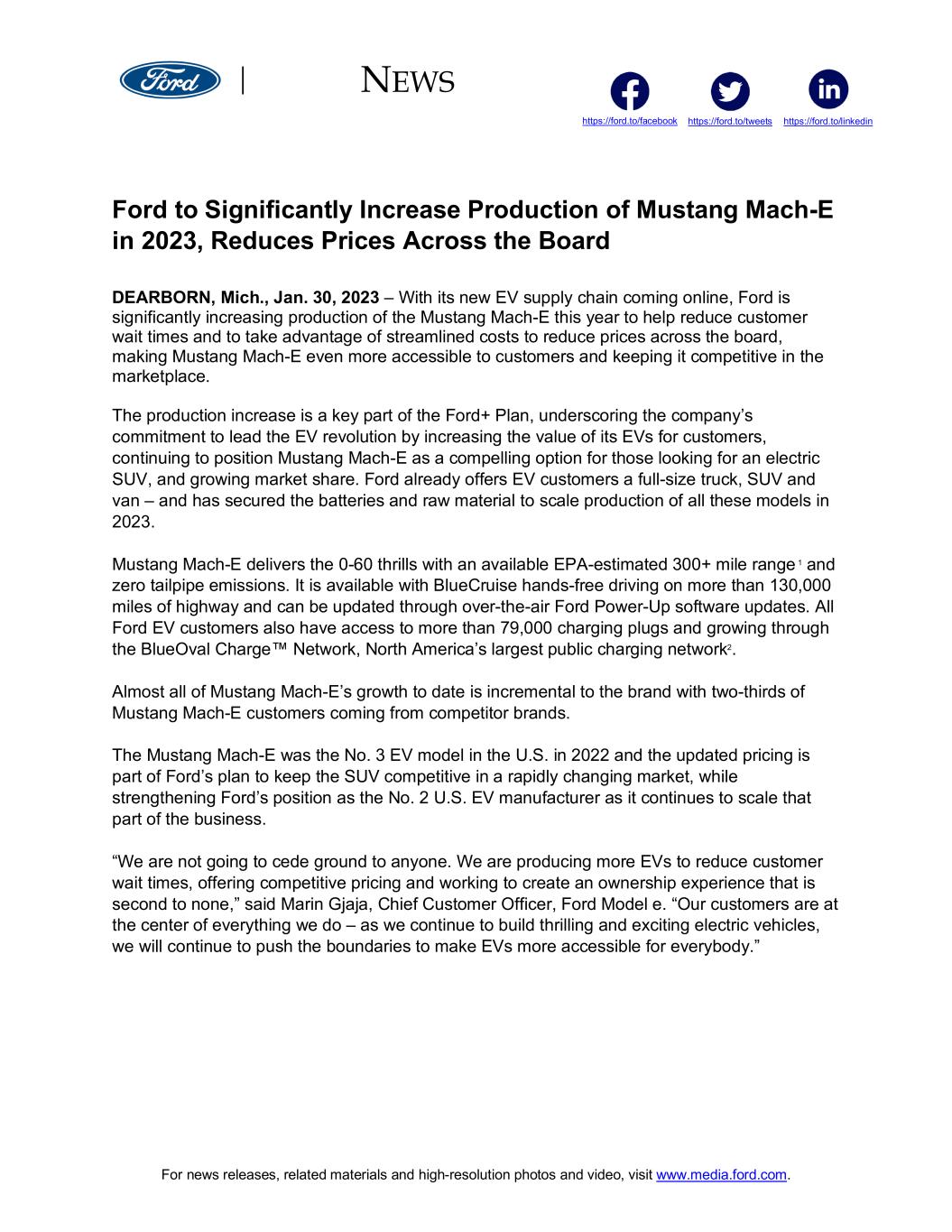 NEWS For news releases, related materials and high-resolution photos and video, visit www.media.ford.com. https://ford.to/tweets https://ford.to/facebook https://ford.to/linkedin Ford to Significantly Increase Production of Mustang Mach-E in 2023, Reduces Prices Across the Board DEARBORN, Mich., Jan. 30, 2023 – With its new EV supply chain coming online, Ford is significantly increasing production of the Mustang Mach-E this year to help reduce customer wait times and to take advantage of streamlined costs to reduce prices across the board, making Mustang Mach-E even more accessible to customers and keeping it competitive in the marketplace. The production increase is a key part of the Ford+ Plan, underscoring the company’s commitment to lead the EV revolution by increasing the value of its EVs for customers, continuing to position Mustang Mach-E as a compelling option for those looking for an electric SUV, and growing market share. Ford already offers EV customers a full-size truck, SUV and van – and has secured the batteries and raw material to scale production of all these models in 2023. Mustang Mach-E delivers the 0-60 thrills with an available EPA-estimated 300+ mile range 1 and zero tailpipe emissions. It is available with BlueCruise hands-free driving on more than 130,000 miles of highway and can be updated through over-the-air Ford Power-Up software updates. All Ford EV customers also have access to more than 79,000 charging plugs and growing through the BlueOval Charge™ Network, North America’s largest public charging network2. Almost all of Mustang Mach-E’s growth to date is incremental to the brand with two-thirds of Mustang Mach-E customers coming from competitor brands. The Mustang Mach-E was the No. 3 EV model in the U.S. in 2022 and the updated pricing is part of Ford’s plan to keep the SUV competitive in a rapidly changing market, while strengthening Ford’s position as the No. 2 U.S. EV manufacturer as it continues to scale that part of the business. “We are not going to cede ground to anyone. We are producing more EVs to reduce customer wait times, offering competitive pricing and working to create an ownership experience that is second to none,” said Marin Gjaja, Chief Customer Officer, Ford Model e. “Our customers are at the center of everything we do – as we continue to build thrilling and exciting electric vehicles, we will continue to push the boundaries to make EVs more accessible for everybody.”