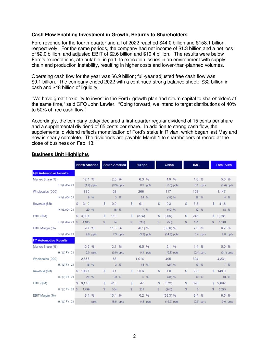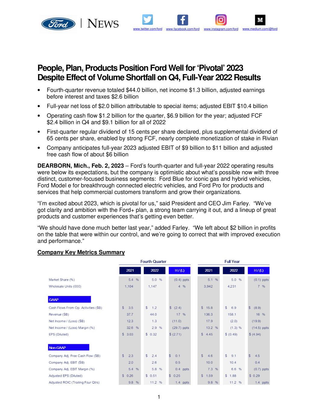 NEWS 1 www.facebook.com/ford www.medium.com/@fordwww.twitter.com/ford www.instagram.com/ford People, Plan, Products Position Ford Well for ‘Pivotal’ 2023 Despite Effect of Volume Shortfall on Q4, Full-Year 2022 Results • Fourth-quarter revenue totaled $44.0 billion, net income $1.3 billion, adjusted earnings before interest and taxes $2.6 billion • Full-year net loss of $2.0 billion attributable to special items; adjusted EBIT $10.4 billion • Operating cash flow $1.2 billion for the quarter, $6.9 billion for the year; adjusted FCF $2.4 billion in Q4 and $9.1 billion for all of 2022 • First-quarter regular dividend of 15 cents per share declared, plus supplemental dividend of 65 cents per share, enabled by strong FCF, nearly complete monetization of stake in Rivian • Company anticipates full-year 2023 adjusted EBIT of $9 billion to $11 billion and adjusted free cash flow of about $6 billion DEARBORN, Mich., Feb. 2, 2023 – Ford’s fourth-quarter and full-year 2022 operating results were below its expectations, but the company is optimistic about what’s possible now with three distinct, customer-focused business segments: Ford Blue for iconic gas and hybrid vehicles, Ford Model e for breakthrough connected electric vehicles, and Ford Pro for products and services that help commercial customers transform and grow their organizations. “I’m excited about 2023, which is pivotal for us,” said President and CEO Jim Farley. “We’ve got clarity and ambition with the Ford+ plan, a strong team carrying it out, and a lineup of great products and customer experiences that’s getting even better. “We should have done much better last year,” added Farley. “We left about $2 billion in profits on the table that were within our control, and we’re going to correct that with improved execution and performance.” Company Key Metrics Summary