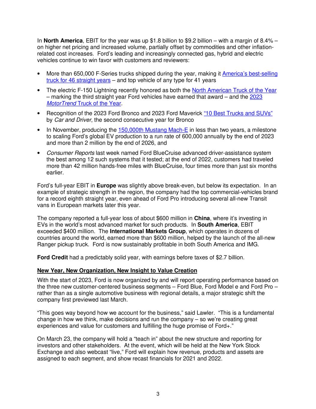 3 In North America, EBIT for the year was up $1.8 billion to $9.2 billion – with a margin of 8.4% – on higher net pricing and increased volume, partially offset by commodities and other inflation- related cost increases. Ford’s leading and increasingly connected gas, hybrid and electric vehicles continue to win favor with customers and reviewers: • More than 650,000 F-Series trucks shipped during the year, making it America’s best-selling truck for 46 straight years – and top vehicle of any type for 41 years • The electric F-150 Lightning recently honored as both the North American Truck of the Year – marking the third straight year Ford vehicles have earned that award – and the 2023 MotorTrend Truck of the Year. • Recognition of the 2023 Ford Bronco and 2023 Ford Maverick “10 Best Trucks and SUVs” by Car and Driver, the second consecutive year for Bronco • In November, producing the 150,000th Mustang Mach-E in less than two years, a milestone to scaling Ford’s global EV production to a run rate of 600,000 annually by the end of 2023 and more than 2 million by the end of 2026, and • Consumer Reports last week named Ford BlueCruise advanced driver-assistance system the best among 12 such systems that it tested; at the end of 2022, customers had traveled more than 42 million hands-free miles with BlueCruise, four times more than just six months earlier. Ford’s full-year EBIT in Europe was slightly above break-even, but below its expectation. In an example of strategic strength in the region, the company had the top commercial-vehicles brand for a record eighth straight year, even ahead of Ford Pro introducing several all-new Transit vans in European markets later this year. The company reported a full-year loss of about $600 million in China, where it’s investing in EVs in the world’s most advanced market for such products. In South America, EBIT exceeded $400 million. The International Markets Group, which operates in dozens of countries around the world, earned more than $600 million, helped by the launch of the all-new Ranger pickup truck. Ford is now sustainably profitable in both South America and IMG. Ford Credit had a predictably solid year, with earnings before taxes of $2.7 billion. New Year, New Organization, New Insight to Value Creation With the start of 2023, Ford is now organized by and will report operating performance based on the three new customer-centered business segments – Ford Blue, Ford Model e and Ford Pro – rather than as a single automotive business with regional details, a major strategic shift the company first previewed last March. “This goes way beyond how we account for the business,” said Lawler. “This is a fundamental change in how we think, make decisions and run the company – so we’re creating great experiences and value for customers and fulfilling the huge promise of Ford+.” On March 23, the company will hold a “teach in” about the new structure and reporting for investors and other stakeholders. At the event, which will be held at the New York Stock Exchange and also webcast “live,” Ford will explain how revenue, products and assets are assigned to each segment, and show recast financials for 2021 and 2022.