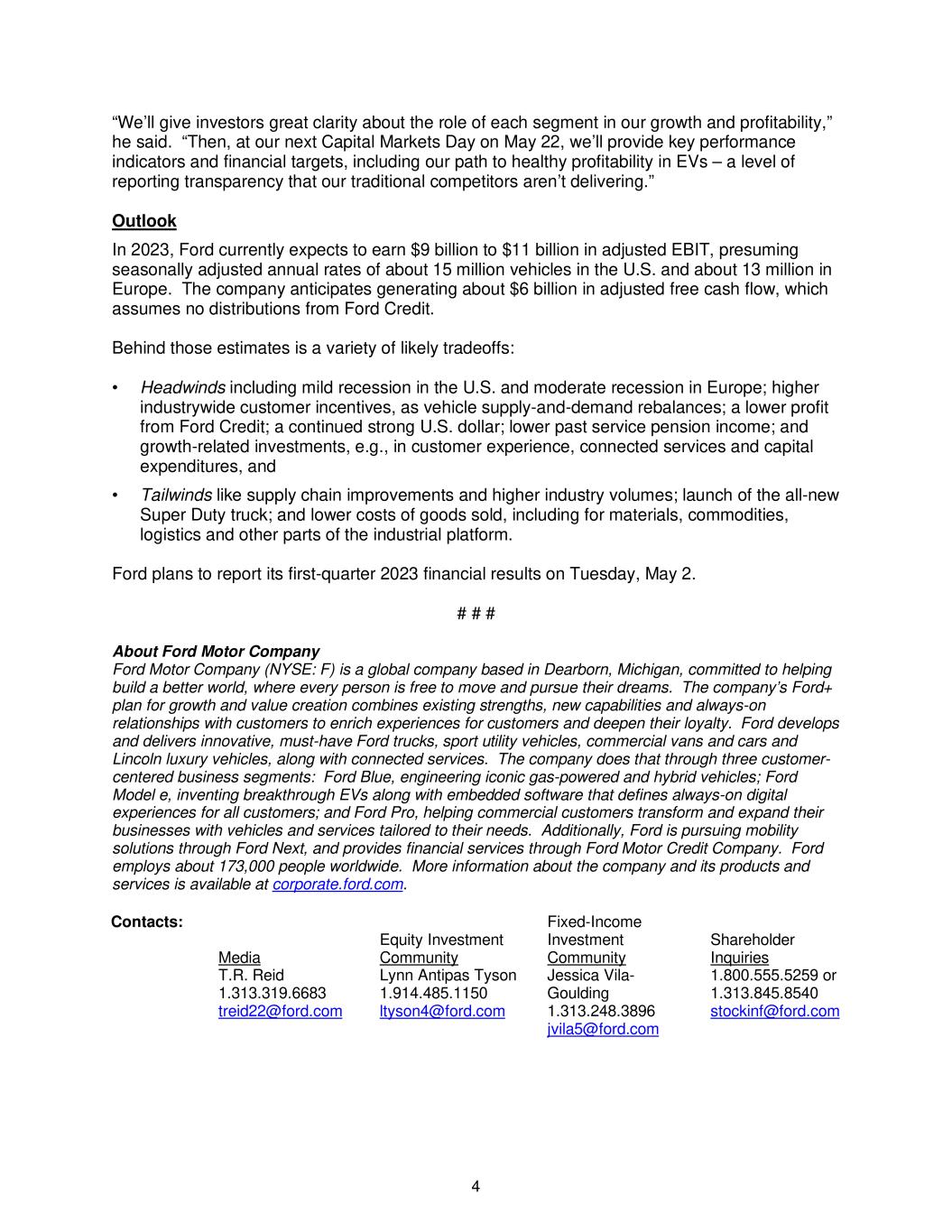 4 “We’ll give investors great clarity about the role of each segment in our growth and profitability,” he said. “Then, at our next Capital Markets Day on May 22, we’ll provide key performance indicators and financial targets, including our path to healthy profitability in EVs – a level of reporting transparency that our traditional competitors aren’t delivering.” Outlook In 2023, Ford currently expects to earn $9 billion to $11 billion in adjusted EBIT, presuming seasonally adjusted annual rates of about 15 million vehicles in the U.S. and about 13 million in Europe. The company anticipates generating about $6 billion in adjusted free cash flow, which assumes no distributions from Ford Credit. Behind those estimates is a variety of likely tradeoffs: • Headwinds including mild recession in the U.S. and moderate recession in Europe; higher industrywide customer incentives, as vehicle supply-and-demand rebalances; a lower profit from Ford Credit; a continued strong U.S. dollar; lower past service pension income; and growth-related investments, e.g., in customer experience, connected services and capital expenditures, and • Tailwinds like supply chain improvements and higher industry volumes; launch of the all-new Super Duty truck; and lower costs of goods sold, including for materials, commodities, logistics and other parts of the industrial platform. Ford plans to report its first-quarter 2023 financial results on Tuesday, May 2. # # # About Ford Motor Company Ford Motor Company (NYSE: F) is a global company based in Dearborn, Michigan, committed to helping build a better world, where every person is free to move and pursue their dreams. The company’s Ford+ plan for growth and value creation combines existing strengths, new capabilities and always-on relationships with customers to enrich experiences for customers and deepen their loyalty. Ford develops and delivers innovative, must-have Ford trucks, sport utility vehicles, commercial vans and cars and Lincoln luxury vehicles, along with connected services. The company does that through three customer- centered business segments: Ford Blue, engineering iconic gas-powered and hybrid vehicles; Ford Model e, inventing breakthrough EVs along with embedded software that defines always-on digital experiences for all customers; and Ford Pro, helping commercial customers transform and expand their businesses with vehicles and services tailored to their needs. Additionally, Ford is pursuing mobility solutions through Ford Next, and provides financial services through Ford Motor Credit Company. Ford employs about 173,000 people worldwide. More information about the company and its products and services is available at corporate.ford.com. Contacts: Fixed-Income Media T.R. Reid 1.313.319.6683 Equity Investment Community Lynn Antipas Tyson 1.914.485.1150 Investment Community Jessica Vila- Goulding Shareholder Inquiries 1.800.555.5259 or 1.313.845.8540 treid22@ford.com ltyson4@ford.com 1.313.248.3896 jvila5@ford.com stockinf@ford.com