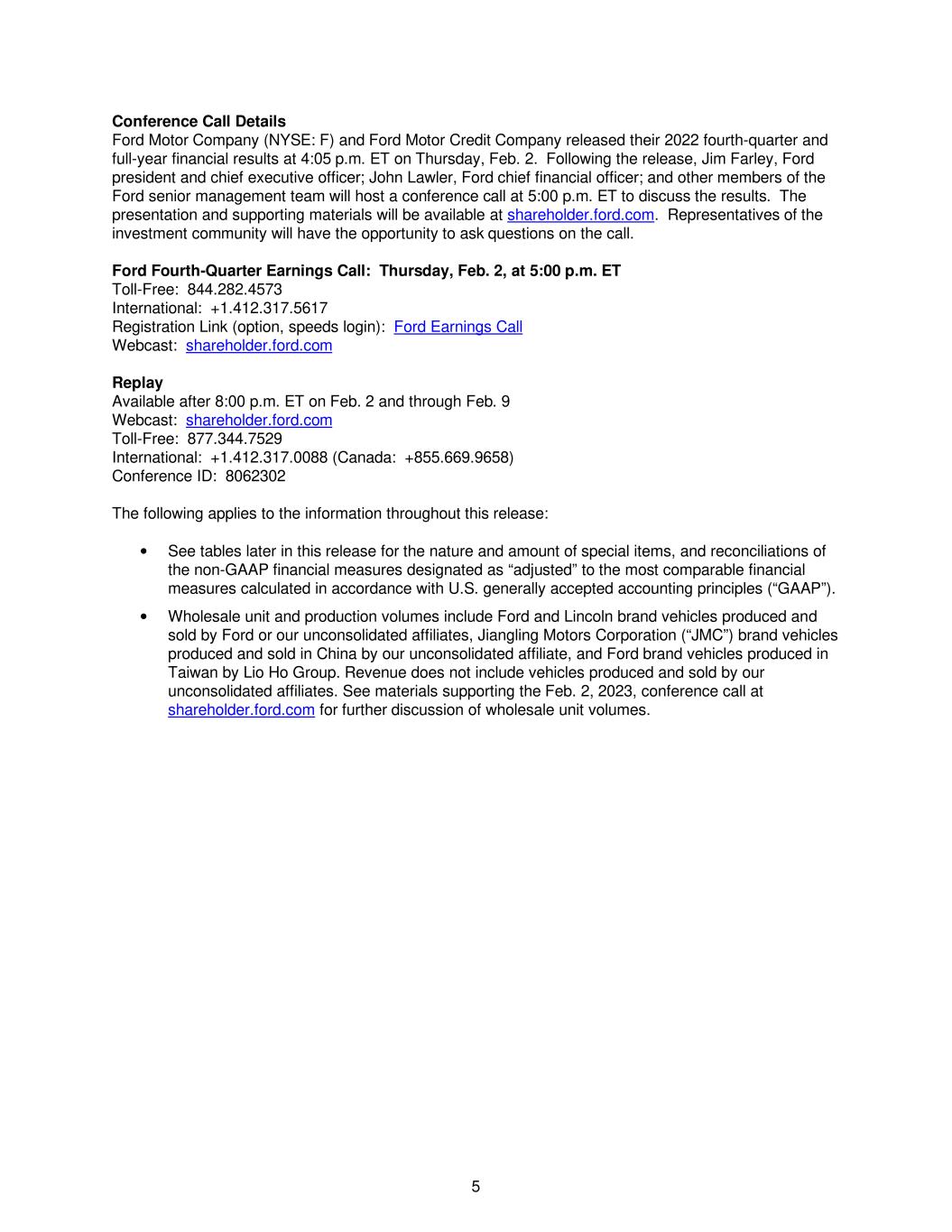 5 Conference Call Details Ford Motor Company (NYSE: F) and Ford Motor Credit Company released their 2022 fourth-quarter and full-year financial results at 4:05 p.m. ET on Thursday, Feb. 2. Following the release, Jim Farley, Ford president and chief executive officer; John Lawler, Ford chief financial officer; and other members of the Ford senior management team will host a conference call at 5:00 p.m. ET to discuss the results. The presentation and supporting materials will be available at shareholder.ford.com. Representatives of the investment community will have the opportunity to ask questions on the call. Ford Fourth-Quarter Earnings Call: Thursday, Feb. 2, at 5:00 p.m. ET Toll-Free: 844.282.4573 International: +1.412.317.5617 Registration Link (option, speeds login): Ford Earnings Call Webcast: shareholder.ford.com Replay Available after 8:00 p.m. ET on Feb. 2 and through Feb. 9 Webcast: shareholder.ford.com Toll-Free: 877.344.7529 International: +1.412.317.0088 (Canada: +855.669.9658) Conference ID: 8062302 The following applies to the information throughout this release: • See tables later in this release for the nature and amount of special items, and reconciliations of the non-GAAP financial measures designated as “adjusted” to the most comparable financial measures calculated in accordance with U.S. generally accepted accounting principles (“GAAP”). • Wholesale unit and production volumes include Ford and Lincoln brand vehicles produced and sold by Ford or our unconsolidated affiliates, Jiangling Motors Corporation (“JMC”) brand vehicles produced and sold in China by our unconsolidated affiliate, and Ford brand vehicles produced in Taiwan by Lio Ho Group. Revenue does not include vehicles produced and sold by our unconsolidated affiliates. See materials supporting the Feb. 2, 2023, conference call at shareholder.ford.com for further discussion of wholesale unit volumes.