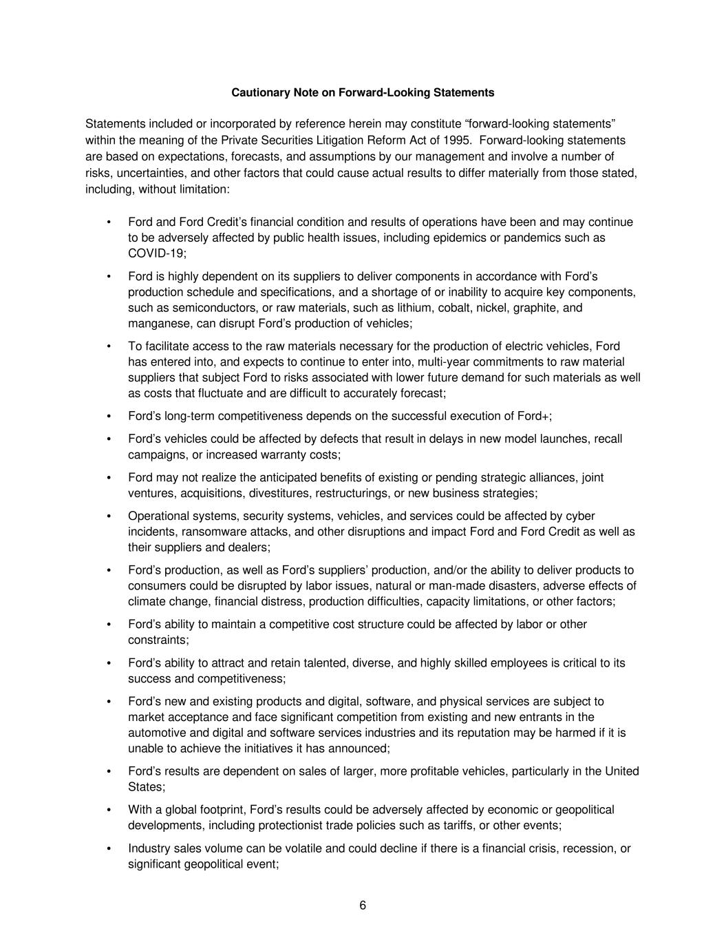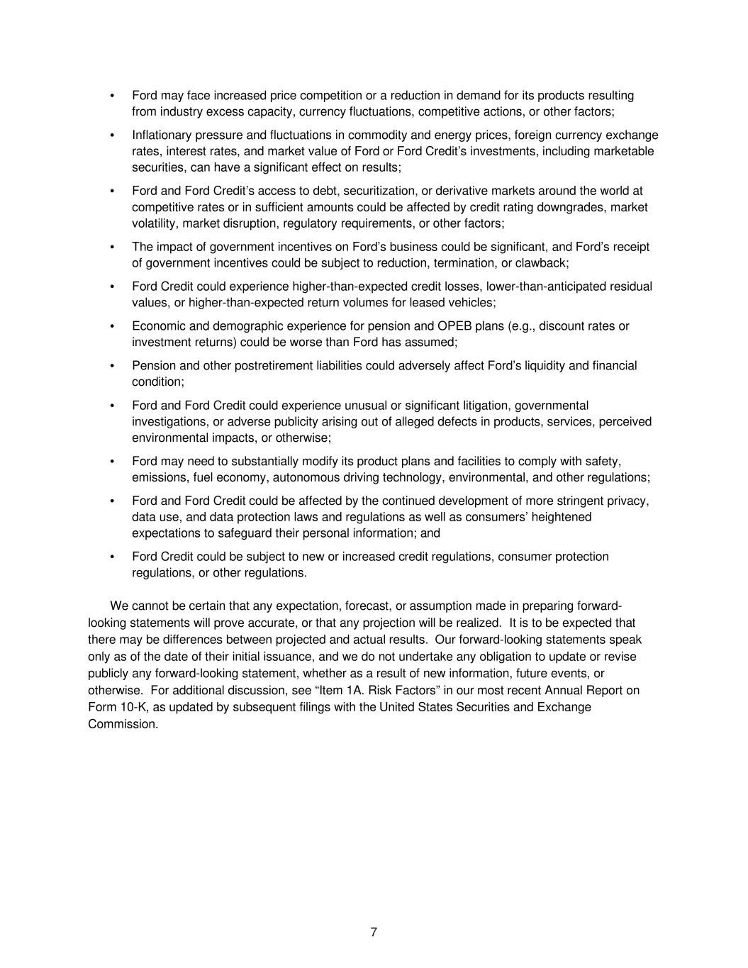 7 • Ford may face increased price competition or a reduction in demand for its products resulting from industry excess capacity, currency fluctuations, competitive actions, or other factors; • Inflationary pressure and fluctuations in commodity and energy prices, foreign currency exchange rates, interest rates, and market value of Ford or Ford Credit’s investments, including marketable securities, can have a significant effect on results; • Ford and Ford Credit’s access to debt, securitization, or derivative markets around the world at competitive rates or in sufficient amounts could be affected by credit rating downgrades, market volatility, market disruption, regulatory requirements, or other factors; • The impact of government incentives on Ford’s business could be significant, and Ford’s receipt of government incentives could be subject to reduction, termination, or clawback; • Ford Credit could experience higher-than-expected credit losses, lower-than-anticipated residual values, or higher-than-expected return volumes for leased vehicles; • Economic and demographic experience for pension and OPEB plans (e.g., discount rates or investment returns) could be worse than Ford has assumed; • Pension and other postretirement liabilities could adversely affect Ford’s liquidity and financial condition; • Ford and Ford Credit could experience unusual or significant litigation, governmental investigations, or adverse publicity arising out of alleged defects in products, services, perceived environmental impacts, or otherwise; • Ford may need to substantially modify its product plans and facilities to comply with safety, emissions, fuel economy, autonomous driving technology, environmental, and other regulations; • Ford and Ford Credit could be affected by the continued development of more stringent privacy, data use, and data protection laws and regulations as well as consumers’ heightened expectations to safeguard their personal information; and • Ford Credit could be subject to new or increased credit regulations, consumer protection regulations, or other regulations. We cannot be certain that any expectation, forecast, or assumption made in preparing forward- looking statements will prove accurate, or that any projection will be realized. It is to be expected that there may be differences between projected and actual results. Our forward-looking statements speak only as of the date of their initial issuance, and we do not undertake any obligation to update or revise publicly any forward-looking statement, whether as a result of new information, future events, or otherwise. For additional discussion, see “Item 1A. Risk Factors” in our most recent Annual Report on Form 10-K, as updated by subsequent filings with the United States Securities and Exchange Commission.