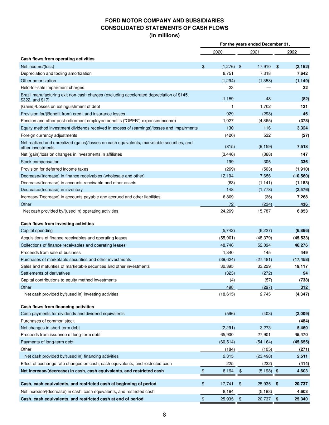8 FORD MOTOR COMPANY AND SUBSIDIARIES CONSOLIDATED STATEMENTS OF CASH FLOWS (in millions) For the years ended December 31, 2020 2021 2022 Cash flows from operating activities Net income/(loss) $ (1,276) $ 17,910 $ (2,152) Depreciation and tooling amortization 8,751 7,318 7,642 Other amortization (1,294) (1,358) (1,149) Held-for-sale impairment charges 23 — 32 Brazil manufacturing exit non-cash charges (excluding accelerated depreciation of $145, $322, and $17) 1,159 48 (82) (Gains)/Losses on extinguishment of debt 1 1,702 121 Provision for/(Benefit from) credit and insurance losses 929 (298) 46 Pension and other post-retirement employee benefits (“OPEB”) expense/(income) 1,027 (4,865) (378) Equity method investment dividends received in excess of (earnings)/losses and impairments 130 116 3,324 Foreign currency adjustments (420) 532 (27) Net realized and unrealized (gains)/losses on cash equivalents, marketable securities, and other investments (315) (9,159) 7,518 Net (gain)/loss on changes in investments in affiliates (3,446) (368) 147 Stock compensation 199 305 336 Provision for deferred income taxes (269) (563) (1,910) Decrease/(Increase) in finance receivables (wholesale and other) 12,104 7,656 (10,560) Decrease/(Increase) in accounts receivable and other assets (63) (1,141) (1,183) Decrease/(Increase) in inventory 148 (1,778) (2,576) Increase/(Decrease) in accounts payable and accrued and other liabilities 6,809 (36) 7,268 Other 72 (234) 436 Net cash provided by/(used in) operating activities 24,269 15,787 6,853 Cash flows from investing activities Capital spending (5,742) (6,227) (6,866) Acquisitions of finance receivables and operating leases (55,901) (48,379) (45,533) Collections of finance receivables and operating leases 48,746 52,094 46,276 Proceeds from sale of business 1,340 145 449 Purchases of marketable securities and other investments (39,624) (27,491) (17,458) Sales and maturities of marketable securities and other investments 32,395 33,229 19,117 Settlements of derivatives (323) (272) 94 Capital contributions to equity method investments (4) (57) (738) Other 498 (297) 312 Net cash provided by/(used in) investing activities (18,615) 2,745 (4,347) Cash flows from financing activities Cash payments for dividends and dividend equivalents (596) (403) (2,009) Purchases of common stock — — (484) Net changes in short-term debt (2,291) 3,273 5,460 Proceeds from issuance of long-term debt 65,900 27,901 45,470 Payments of long-term debt (60,514) (54,164) (45,655) Other (184) (105) (271) Net cash provided by/(used in) financing activities 2,315 (23,498) 2,511 Effect of exchange rate changes on cash, cash equivalents, and restricted cash 225 (232) (414) Net increase/(decrease) in cash, cash equivalents, and restricted cash $ 8,194 $ (5,198) $ 4,603 Cash, cash equivalents, and restricted cash at beginning of period $ 17,741 $ 25,935 $ 20,737 Net increase/(decrease) in cash, cash equivalents, and restricted cash 8,194 (5,198) 4,603 Cash, cash equivalents, and restricted cash at end of period $ 25,935 $ 20,737 $ 25,340
