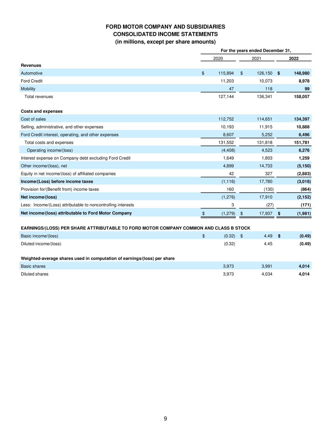 9 FORD MOTOR COMPANY AND SUBSIDIARIES CONSOLIDATED INCOME STATEMENTS (in millions, except per share amounts) For the years ended December 31, 2020 2021 2022 Revenues Automotive $ 115,894 $ 126,150 $ 148,980 Ford Credit 11,203 10,073 8,978 Mobility 47 118 99 Total revenues 127,144 136,341 158,057 Costs and expenses Cost of sales 112,752 114,651 134,397 Selling, administrative, and other expenses 10,193 11,915 10,888 Ford Credit interest, operating, and other expenses 8,607 5,252 6,496 Total costs and expenses 131,552 131,818 151,781 Operating income/(loss) (4,408) 4,523 6,276 Interest expense on Company debt excluding Ford Credit 1,649 1,803 1,259 Other income/(loss), net 4,899 14,733 (5,150) Equity in net income/(loss) of affiliated companies 42 327 (2,883) Income/(Loss) before income taxes (1,116) 17,780 (3,016) Provision for/(Benefit from) income taxes 160 (130) (864) Net income/(loss) (1,276) 17,910 (2,152) Less: Income/(Loss) attributable to noncontrolling interests 3 (27) (171) Net income/(loss) attributable to Ford Motor Company $ (1,279) $ 17,937 $ (1,981) EARNINGS/(LOSS) PER SHARE ATTRIBUTABLE TO FORD MOTOR COMPANY COMMON AND CLASS B STOCK Basic income/(loss) $ (0.32) $ 4.49 $ (0.49) Diluted income/(loss) (0.32) 4.45 (0.49) Weighted-average shares used in computation of earnings/(loss) per share Basic shares 3,973 3,991 4,014 Diluted shares 3,973 4,034 4,014