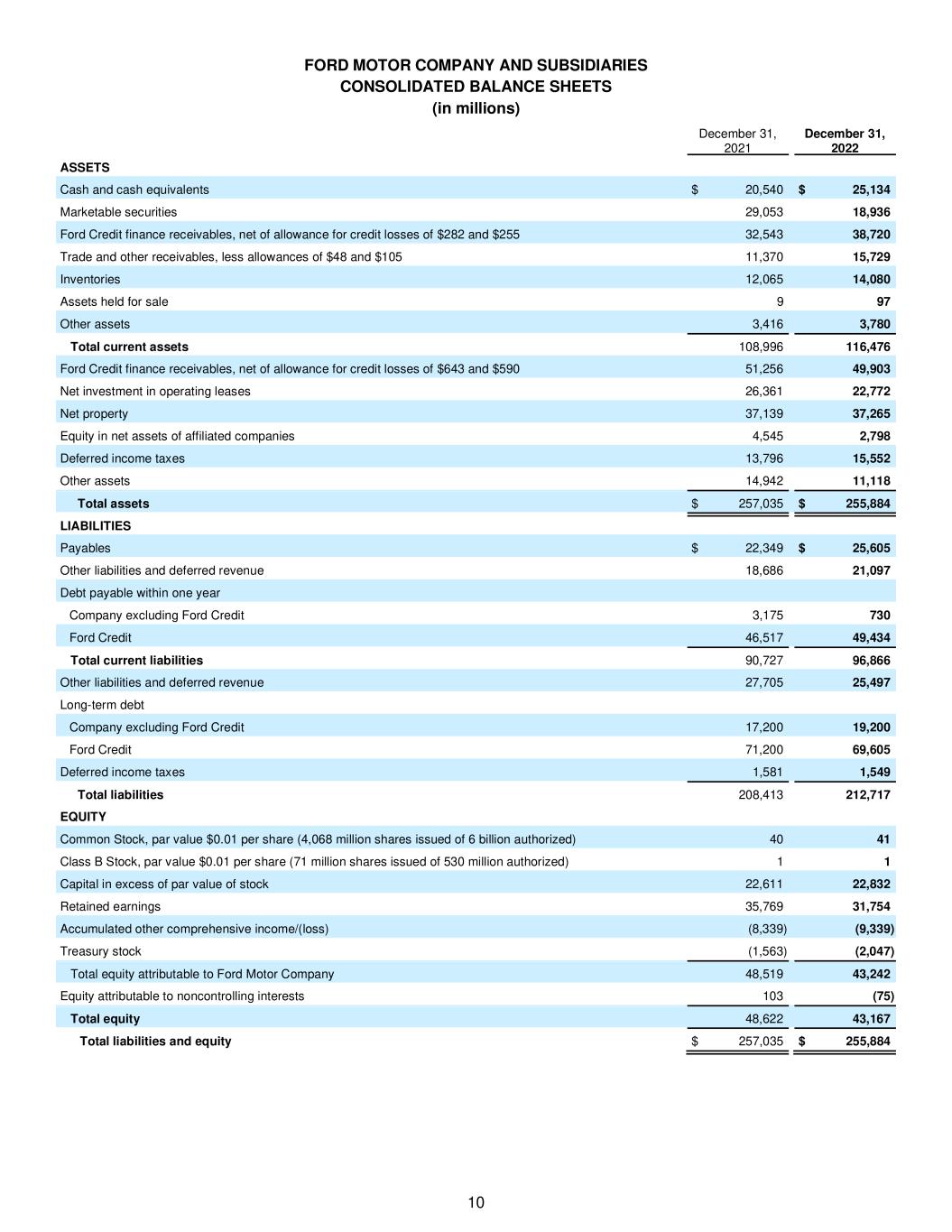 10 FORD MOTOR COMPANY AND SUBSIDIARIES CONSOLIDATED BALANCE SHEETS (in millions) December 31, 2021 December 31, 2022 ASSETS Cash and cash equivalents $ 20,540 $ 25,134 Marketable securities 29,053 18,936 Ford Credit finance receivables, net of allowance for credit losses of $282 and $255 32,543 38,720 Trade and other receivables, less allowances of $48 and $105 11,370 15,729 Inventories 12,065 14,080 Assets held for sale 9 97 Other assets 3,416 3,780 Total current assets 108,996 116,476 Ford Credit finance receivables, net of allowance for credit losses of $643 and $590 51,256 49,903 Net investment in operating leases 26,361 22,772 Net property 37,139 37,265 Equity in net assets of affiliated companies 4,545 2,798 Deferred income taxes 13,796 15,552 Other assets 14,942 11,118 Total assets $ 257,035 $ 255,884 LIABILITIES Payables $ 22,349 $ 25,605 Other liabilities and deferred revenue 18,686 21,097 Debt payable within one year Company excluding Ford Credit 3,175 730 Ford Credit 46,517 49,434 Total current liabilities 90,727 96,866 Other liabilities and deferred revenue 27,705 25,497 Long-term debt Company excluding Ford Credit 17,200 19,200 Ford Credit 71,200 69,605 Deferred income taxes 1,581 1,549 Total liabilities 208,413 212,717 EQUITY Common Stock, par value $0.01 per share (4,068 million shares issued of 6 billion authorized) 40 41 Class B Stock, par value $0.01 per share (71 million shares issued of 530 million authorized) 1 1 Capital in excess of par value of stock 22,611 22,832 Retained earnings 35,769 31,754 Accumulated other comprehensive income/(loss) (8,339) (9,339) Treasury stock (1,563) (2,047) Total equity attributable to Ford Motor Company 48,519 43,242 Equity attributable to noncontrolling interests 103 (75) Total equity 48,622 43,167 Total liabilities and equity $ 257,035 $ 255,884