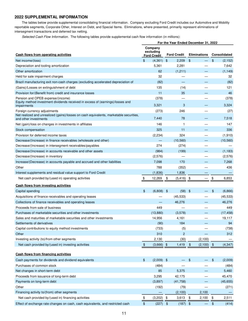 11 2022 SUPPLEMENTAL INFORMATION The tables below provide supplemental consolidating financial information. Company excluding Ford Credit includes our Automotive and Mobility reportable segments, Corporate Other, Interest on Debt, and Special Items. Eliminations, where presented, primarily represent eliminations of intersegment transactions and deferred tax netting. Selected Cash Flow Information. The following tables provide supplemental cash flow information (in millions): For the Year Ended December 31, 2022 Cash flows from operating activities Company excluding Ford Credit Ford Credit Eliminations Consolidated Net income/(loss) $ (4,361) $ 2,209 $ — $ (2,152) Depreciation and tooling amortization 5,361 2,281 — 7,642 Other amortization 62 (1,211) — (1,149) Held for sale impairment charges 32 — — 32 Brazil manufacturing exit non-cash charges (excluding accelerated depreciation of (82) — — (82) (Gains)/Losses on extinguishment of debt 135 (14) — 121 Provision for/(Benefit from) credit and insurance losses 11 35 — 46 Pension and OPEB expense/(income) (378) — — (378) Equity method investment dividends received in excess of (earnings)/losses and impairments 3,321 3 — 3,324 Foreign currency adjustments (273) 246 — (27) Net realized and unrealized (gains)/losses on cash equivalents, marketable securities, and other investments 7,440 78 — 7,518 Net (gain)/loss on changes in investments in affiliates 146 1 — 147 Stock compensation 325 11 — 336 Provision for deferred income taxes (2,234) 324 — (1,910) Decrease/(Increase) in finance receivables (wholesale and other) — (10,560) — (10,560) Decrease/(Increase) in intersegment receivables/payables 274 (274) — — Decrease/(Increase) in accounts receivable and other assets (984) (199) — (1,183) Decrease/(Increase) in inventory (2,576) — — (2,576) Increase/(Decrease) in accounts payable and accrued and other liabilities 7,098 170 — 7,268 Other 788 (352) — 436 Interest supplements and residual value support to Ford Credit (1,836) 1,836 — — Net cash provided by/(used in) operating activities $ 12,269 $ (5,416) $ — $ 6,853 Cash flows from investing activities Capital spending $ (6,808) $ (58) $ — $ (6,866) Acquisitions of finance receivables and operating leases — (45,533) — (45,533) Collections of finance receivables and operating leases — 46,276 — 46,276 Proceeds from sale of business 449 — — 449 Purchases of marketable securities and other investments (13,880) (3,578) — (17,458) Sales and maturities of marketable securities and other investments 14,956 4,161 — 19,117 Settlements of derivatives (90) 184 — 94 Capital contributions to equity method investments (733) (5) — (738) Other 310 2 — 312 Investing activity (to)/from other segments 2,130 (30) (2,100) — Net cash provided by/(used in) investing activities $ (3,666) $ 1,419 $ (2,100) $ (4,347) Cash flows from financing activities Cash payments for dividends and dividend equivalents $ (2,009) $ — $ — $ (2,009) Purchases of common stock (484) — — (484) Net changes in short-term debt 85 5,375 — 5,460 Proceeds from issuance of long-term debt 3,295 42,175 — 45,470 Payments on long-term debt (3,897) (41,758) — (45,655) Other (192) (79) — (271) Financing activity to/(from) other segments — (2,100) 2,100 — Net cash provided by/(used in) financing activities $ (3,202) $ 3,613 $ 2,100 $ 2,511 Effect of exchange rate changes on cash, cash equivalents, and restricted cash $ (227) $ (187) $ — $ (414)