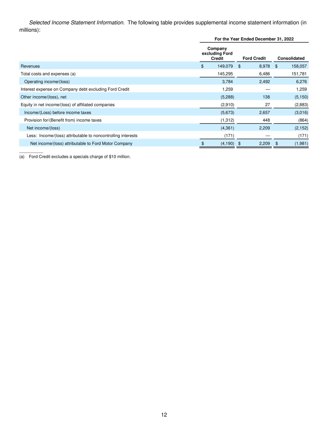 12 Selected Income Statement Information. The following table provides supplemental income statement information (in millions): For the Year Ended December 31, 2022 Company excluding Ford Credit Ford Credit Consolidated Revenues $ 149,079 $ 8,978 $ 158,057 Total costs and expenses (a) 145,295 6,486 151,781 Operating income/(loss) 3,784 2,492 6,276 Interest expense on Company debt excluding Ford Credit 1,259 — 1,259 Other income/(loss), net (5,288) 138 (5,150) Equity in net income/(loss) of affiliated companies (2,910) 27 (2,883) Income/(Loss) before income taxes (5,673) 2,657 (3,016) Provision for/(Benefit from) income taxes (1,312) 448 (864) Net income/(loss) (4,361) 2,209 (2,152) Less: Income/(loss) attributable to noncontrolling interests (171) — (171) Net income/(loss) attributable to Ford Motor Company $ (4,190) $ 2,209 $ (1,981) __________ (a) Ford Credit excludes a specials charge of $10 million.