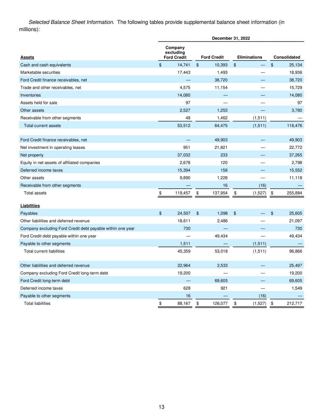 13 Selected Balance Sheet Information. The following tables provide supplemental balance sheet information (in millions): December 31, 2022 Assets Company excluding Ford Credit Ford Credit Eliminations Consolidated Cash and cash equivalents $ 14,741 $ 10,393 $ — $ 25,134 Marketable securities 17,443 1,493 — 18,936 Ford Credit finance receivables, net — 38,720 — 38,720 Trade and other receivables, net 4,575 11,154 — 15,729 Inventories 14,080 — — 14,080 Assets held for sale 97 — — 97 Other assets 2,527 1,253 — 3,780 Receivable from other segments 49 1,462 (1,511) — Total current assets 53,512 64,475 (1,511) 116,476 Ford Credit finance receivables, net — 49,903 — 49,903 Net investment in operating leases 951 21,821 — 22,772 Net property 37,032 233 — 37,265 Equity in net assets of affiliated companies 2,678 120 — 2,798 Deferred income taxes 15,394 158 — 15,552 Other assets 9,890 1,228 — 11,118 Receivable from other segments — 16 (16) — Total assets $ 119,457 $ 137,954 $ (1,527) $ 255,884 Liabilities Payables $ 24,507 $ 1,098 $ — $ 25,605 Other liabilities and deferred revenue 18,611 2,486 — 21,097 Company excluding Ford Credit debt payable within one year 730 — — 730 Ford Credit debt payable within one year — 49,434 — 49,434 Payable to other segments 1,511 — (1,511) — Total current liabilities 45,359 53,018 (1,511) 96,866 Other liabilities and deferred revenue 22,964 2,533 — 25,497 Company excluding Ford Credit long-term debt 19,200 — — 19,200 Ford Credit long-term debt — 69,605 — 69,605 Deferred income taxes 628 921 — 1,549 Payable to other segments 16 — (16) — Total liabilities $ 88,167 $ 126,077 $ (1,527) $ 212,717