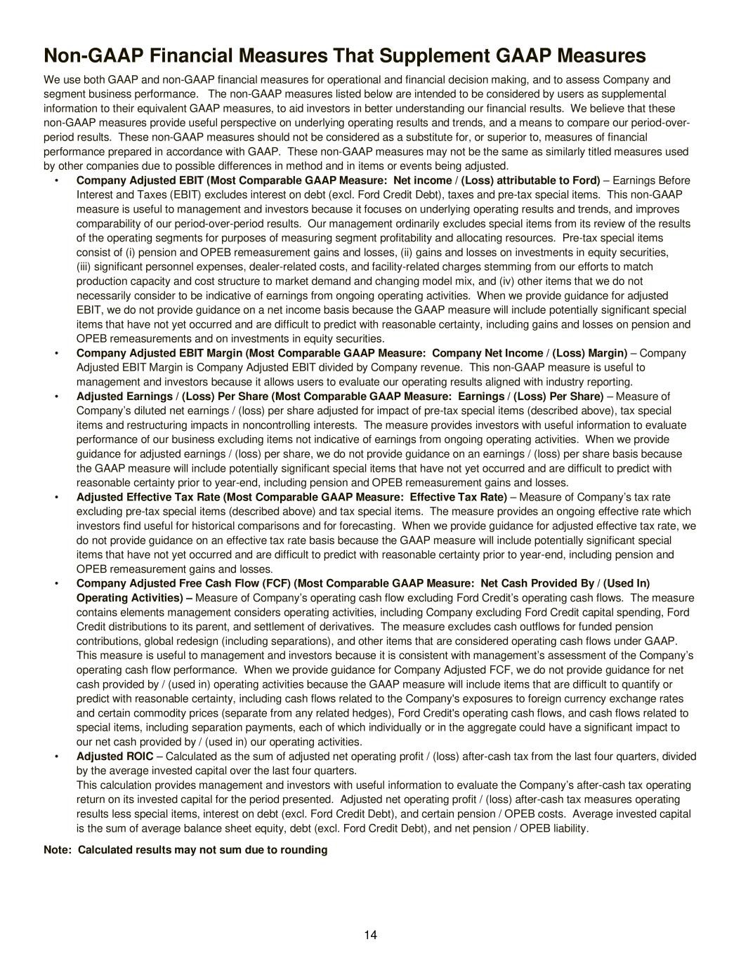 14 Non-GAAP Financial Measures That Supplement GAAP Measures We use both GAAP and non-GAAP financial measures for operational and financial decision making, and to assess Company and segment business performance. The non-GAAP measures listed below are intended to be considered by users as supplemental information to their equivalent GAAP measures, to aid investors in better understanding our financial results. We believe that these non-GAAP measures provide useful perspective on underlying operating results and trends, and a means to compare our period-over- period results. These non-GAAP measures should not be considered as a substitute for, or superior to, measures of financial performance prepared in accordance with GAAP. These non-GAAP measures may not be the same as similarly titled measures used by other companies due to possible differences in method and in items or events being adjusted. • Company Adjusted EBIT (Most Comparable GAAP Measure: Net income / (Loss) attributable to Ford) – Earnings Before Interest and Taxes (EBIT) excludes interest on debt (excl. Ford Credit Debt), taxes and pre-tax special items. This non-GAAP measure is useful to management and investors because it focuses on underlying operating results and trends, and improves comparability of our period-over-period results. Our management ordinarily excludes special items from its review of the results of the operating segments for purposes of measuring segment profitability and allocating resources. Pre-tax special items consist of (i) pension and OPEB remeasurement gains and losses, (ii) gains and losses on investments in equity securities, (iii) significant personnel expenses, dealer-related costs, and facility-related charges stemming from our efforts to match production capacity and cost structure to market demand and changing model mix, and (iv) other items that we do not necessarily consider to be indicative of earnings from ongoing operating activities. When we provide guidance for adjusted EBIT, we do not provide guidance on a net income basis because the GAAP measure will include potentially significant special items that have not yet occurred and are difficult to predict with reasonable certainty, including gains and losses on pension and OPEB remeasurements and on investments in equity securities. • Company Adjusted EBIT Margin (Most Comparable GAAP Measure: Company Net Income / (Loss) Margin) – Company Adjusted EBIT Margin is Company Adjusted EBIT divided by Company revenue. This non-GAAP measure is useful to management and investors because it allows users to evaluate our operating results aligned with industry reporting. • Adjusted Earnings / (Loss) Per Share (Most Comparable GAAP Measure: Earnings / (Loss) Per Share) – Measure of Company’s diluted net earnings / (loss) per share adjusted for impact of pre-tax special items (described above), tax special items and restructuring impacts in noncontrolling interests. The measure provides investors with useful information to evaluate performance of our business excluding items not indicative of earnings from ongoing operating activities. When we provide guidance for adjusted earnings / (loss) per share, we do not provide guidance on an earnings / (loss) per share basis because the GAAP measure will include potentially significant special items that have not yet occurred and are difficult to predict with reasonable certainty prior to year-end, including pension and OPEB remeasurement gains and losses. • Adjusted Effective Tax Rate (Most Comparable GAAP Measure: Effective Tax Rate) – Measure of Company’s tax rate excluding pre-tax special items (described above) and tax special items. The measure provides an ongoing effective rate which investors find useful for historical comparisons and for forecasting. When we provide guidance for adjusted effective tax rate, we do not provide guidance on an effective tax rate basis because the GAAP measure will include potentially significant special items that have not yet occurred and are difficult to predict with reasonable certainty prior to year-end, including pension and OPEB remeasurement gains and losses. • Company Adjusted Free Cash Flow (FCF) (Most Comparable GAAP Measure: Net Cash Provided By / (Used In) Operating Activities) – Measure of Company’s operating cash flow excluding Ford Credit’s operating cash flows. The measure contains elements management considers operating activities, including Company excluding Ford Credit capital spending, Ford Credit distributions to its parent, and settlement of derivatives. The measure excludes cash outflows for funded pension contributions, global redesign (including separations), and other items that are considered operating cash flows under GAAP. This measure is useful to management and investors because it is consistent with management’s assessment of the Company’s operating cash flow performance. When we provide guidance for Company Adjusted FCF, we do not provide guidance for net cash provided by / (used in) operating activities because the GAAP measure will include items that are difficult to quantify or predict with reasonable certainty, including cash flows related to the Company's exposures to foreign currency exchange rates and certain commodity prices (separate from any related hedges), Ford Credit's operating cash flows, and cash flows related to special items, including separation payments, each of which individually or in the aggregate could have a significant impact to our net cash provided by / (used in) our operating activities. • Adjusted ROIC – Calculated as the sum of adjusted net operating profit / (loss) after-cash tax from the last four quarters, divided by the average invested capital over the last four quarters. This calculation provides management and investors with useful information to evaluate the Company’s after-cash tax operating return on its invested capital for the period presented. Adjusted net 