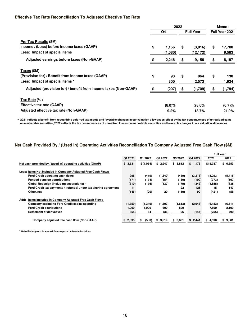 15 Net Income / (Loss) Reconciliation To Adjusted EBIT ($M) Earnings / (Loss) Per Share Reconciliation To Adjusted Earnings / (Loss) Per Share 2021 2022 2021 2022 Net income / (loss) attributable to Ford (GAAP) 12,282$ 1,289$ 17,937$ (1,981)$ Income / (Loss) attributable to non-controlling interests (9) (30) (27) (171) Net income / (loss) 12,273$ 1,259$ 17,910$ (2,152)$ Less: (Provision for) / Benefit from income taxes * 1,055 93 130 864 Income / (Loss) before income taxes 11,218$ 1,166$ 17,780$ (3,016)$ Less: Special items pre-tax 9,614 (1,080) 9,583 (12,172) Income / (Loss) before special items pre-tax 1,604$ 2,246$ 8,197$ 9,156$ Less: Interest on debt (438) (318) (1,803) (1,259) Adjusted EBIT (Non-GAAP) 2,042$ 2,564$ 10,000$ 10,415$ Memo: Revenue ($B) 37.7$ 44.0$ 136.3$ 158.1$ Net income / (loss) margin (GAAP) (%) 32.6% 2.9% 13.2% (1.3)% Adjusted EBIT margin (%) 5.4% 5.8% 7.3% 6.6% * Fourth Quarter Full Year 2021 reflects a benefit from recognizing deferred tax assets and favorable changes in our valuation allowances offset by the tax consequences of unrealized gains on marketable securities; 2022 reflects the tax consequences of unrealized losses on marketable securities and favorable changes in our valuation allowances 2021 2022 2021 2022 Diluted After-Tax Results ($M) Diluted after-tax results (GAAP) 12,282$ 1,289$ 17,937$ (1,981)$ Less: Impact of pre-tax and tax special items 11,220 (780) 11,507 (9,599) Adjusted net income – diluted (Non-GAAP) 1,062$ 2,069$ 6,430$ 7,618$ Basic and Diluted Shares (M) Basic shares (average shares outstanding) 3,999 4,004 3,991 4,014 Diluted shares 4,055 4,047 4,034 4,056 Earnings / (Loss) per share – diluted (GAAP) * 3.03$ 0.32$ 4.45$ (0.49)$ Less: Net impact of adjustments 2.77 (0.19) 2.86 (2.37) Adjusted earnings per share – diluted (Non-GAAP) 0.26$ 0.51$ 1.59$ 1.88$ * For Full Year 2022, there were 42 million shares excluded from the calculation of diluted earnings/(loss) per share, due to their anti-dilutive effect Fourth Quarter Full Year Net dilutive options, unvested restricted stock units, unvested restricted stock shares, and convertible debt 56 43 43 42