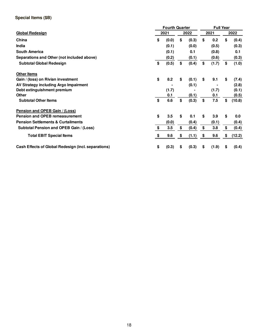 17 Adjusted ROIC ($B) Four Quarters Four Quarters Ending Q4 2021 Ending Q4 2022 Adjusted Net Operating Profit / (Loss) After Cash Tax Net income / (loss) attributable to Ford 17.9$ (2.0)$ Add: Non-controlling interest (0.0) (0.2) Less: Income tax 0.1 0.9 Add: Cash tax (0.6) (0.8) Less: Interest on debt (1.8) (1.3) Less: Total pension / OPEB income / (cost) 4.9 0.4 Add: Pension / OPEB service costs (1.1) (1.0) Net operating profit / (loss) after cash tax 13.0$ (3.9)$ Less: Special items (excl. pension / OPEB) pre-tax 5.9 (11.7) Adj. net operating profit / (loss) after cash tax 7.1$ 7.8$ Invested Capital Equity 48.6$ 43.2$ Debt (excl. Ford Credit) 20.4 19.9 Net pension and OPEB liability 6.4 4.7 Invested capital (end of period) 75.4$ 67.8$ Average invested capital 72.1$ 70.0$ ROIC (a) 18.0% (5.6)% Adjusted ROIC (Non-GAAP) (b) 9.8% 11.2% a. Calculated as the sum of net operating profit / (loss) after cash tax from the last four quarters, divided by the average invested capital over the last four quarters b. Calculated as the sum of adjusted net operating profit / (loss) after cash tax from the last four quarters, divided by the average invested capital over the last four quarters