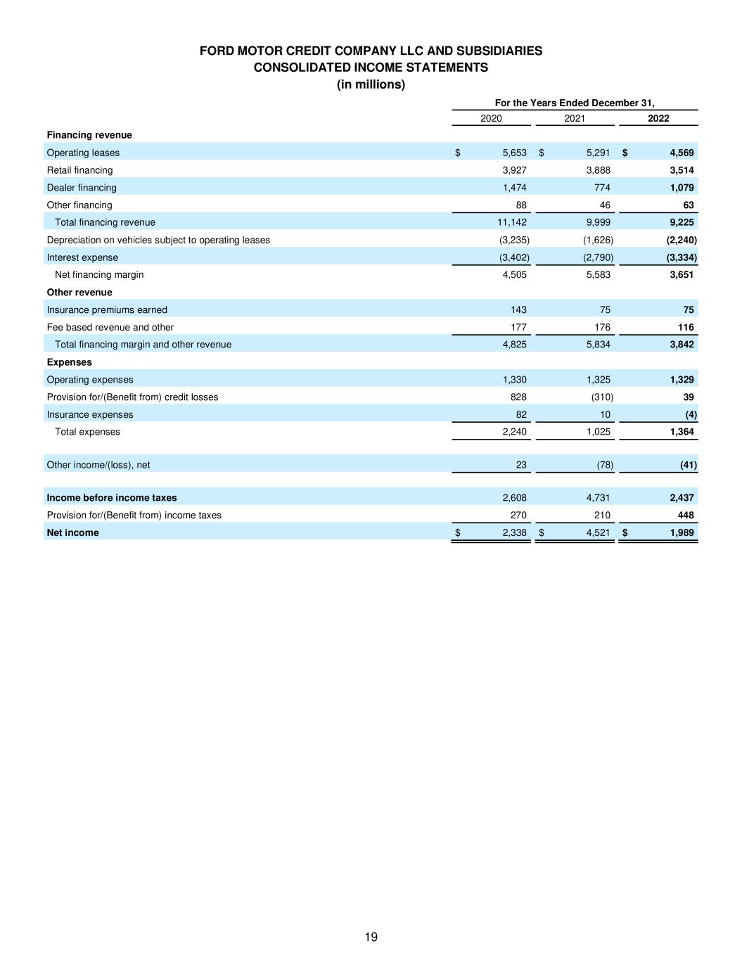 19 FORD MOTOR CREDIT COMPANY LLC AND SUBSIDIARIES CONSOLIDATED INCOME STATEMENTS (in millions) For the Years Ended December 31, 2020 2021 2022 Financing revenue Operating leases $ 5,653 $ 5,291 $ 4,569 Retail financing 3,927 3,888 3,514 Dealer financing 1,474 774 1,079 Other financing 88 46 63 Total financing revenue 11,142 9,999 9,225 Depreciation on vehicles subject to operating leases (3,235) (1,626) (2,240) Interest expense (3,402) (2,790) (3,334) Net financing margin 4,505 5,583 3,651 Other revenue Insurance premiums earned 143 75 75 Fee based revenue and other 177 176 116 Total financing margin and other revenue 4,825 5,834 3,842 Expenses Operating expenses 1,330 1,325 1,329 Provision for/(Benefit from) credit losses 828 (310) 39 Insurance expenses 82 10 (4) Total expenses 2,240 1,025 1,364 Other income/(loss), net 23 (78) (41) Income before income taxes 2,608 4,731 2,437 Provision for/(Benefit from) income taxes 270 210 448 Net income $ 2,338 $ 4,521 $ 1,989