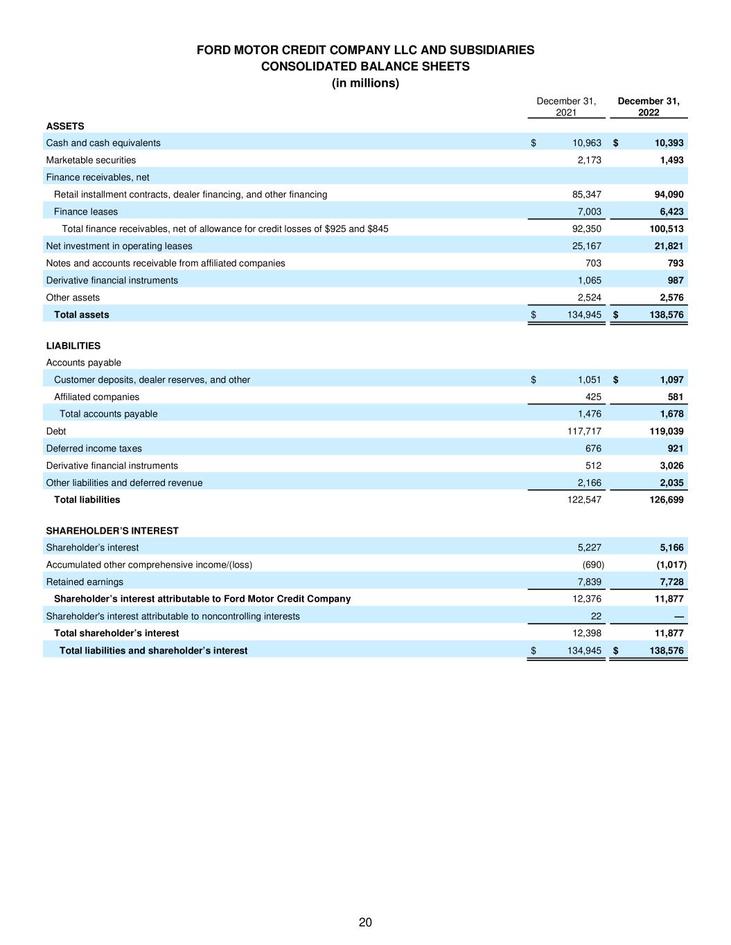 20 FORD MOTOR CREDIT COMPANY LLC AND SUBSIDIARIES CONSOLIDATED BALANCE SHEETS (in millions) December 31, 2021 December 31, 2022 ASSETS Cash and cash equivalents $ 10,963 $ 10,393 Marketable securities 2,173 1,493 Finance receivables, net Retail installment contracts, dealer financing, and other financing 85,347 94,090 Finance leases 7,003 6,423 Total finance receivables, net of allowance for credit losses of $925 and $845 92,350 100,513 Net investment in operating leases 25,167 21,821 Notes and accounts receivable from affiliated companies 703 793 Derivative financial instruments 1,065 987 Other assets 2,524 2,576 Total assets $ 134,945 $ 138,576 LIABILITIES Accounts payable Customer deposits, dealer reserves, and other $ 1,051 $ 1,097 Affiliated companies 425 581 Total accounts payable 1,476 1,678 Debt 117,717 119,039 Deferred income taxes 676 921 Derivative financial instruments 512 3,026 Other liabilities and deferred revenue 2,166 2,035 Total liabilities 122,547 126,699 SHAREHOLDER’S INTEREST Shareholder’s interest 5,227 5,166 Accumulated other comprehensive income/(loss) (690) (1,017) Retained earnings 7,839 7,728 Shareholder’s interest attributable to Ford Motor Credit Company 12,376 11,877 Shareholder's interest attributable to noncontrolling interests 22 — Total shareholder’s interest 12,398 11,877 Total liabilities and shareholder’s interest $ 134,945 $ 138,576